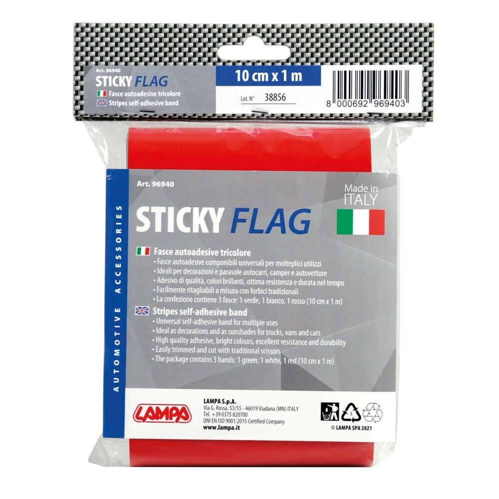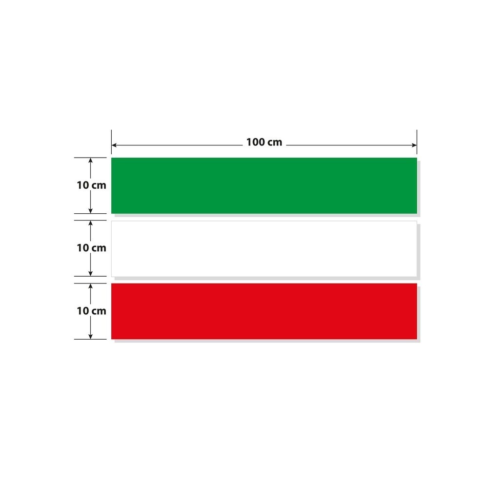 Set composto da 3 spezzoni da 100 cm nei colori verde/bianco/rosso. Posizionabili affiancati (300x10 cm max) o sovrapposti (100x30 cm). Spezzoni ritagliabili e componibili a piacere per costruire una o piu' bandiere a seconda delle necessita' e della lunghezza desiderata. Ideale per decorazioni o come fascia parasole per autocarri, camper, furgoni, autovetture. Adesivo di qualita', colori brillanti, ottima resistenza agli eventi atmosferici a garanzia di una lunga durata nel tempo. Utilizzabili affiancati o sovrapposti. Made in Italy