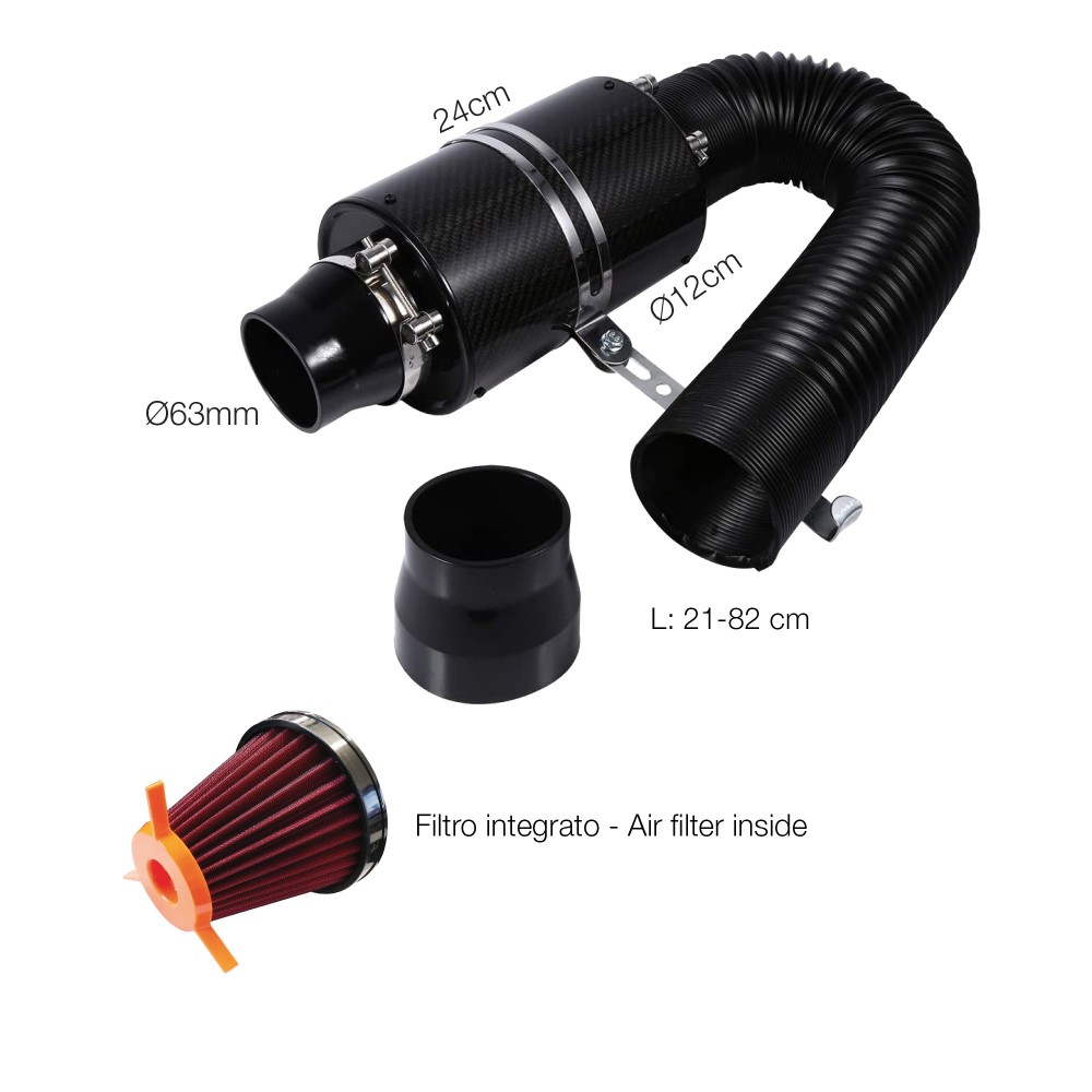Sistema di aspirazione universale composto da: cassa in carbonio, staffa, tubo snodato, 2 raccordi e filtro aria. Ideale per motori fino a 2000cc