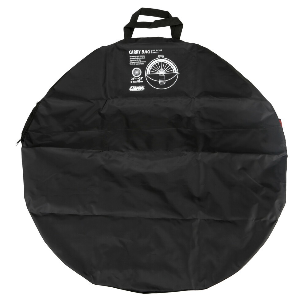 Ideale per proteggere e trasportare comodamente le ruote della tua bicicletta. Compatibile con la maggior parte delle ruote MTB e bici da strada fino a Ø 29". Rinforzo centrale per proteggere perno e mozzo, tasca interna per riporre viti, utensili o altri componenti. Cerniera con apertura a 180° per un facile inserimento. Realizzata in resistente cordura di poliestere lavabile e impermeabile. Capacità max: 2 ruote strada da 26" o 1 ruota da 29", oppure 1 ruota fat da 24", o 1 ruota MTB da 29". Dimensione: 83x83x2,5cm