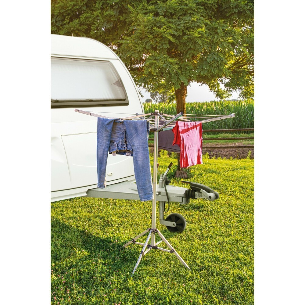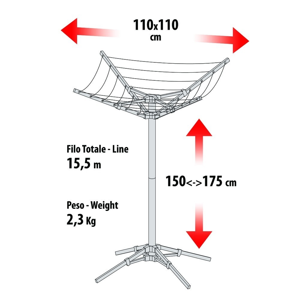 Stendibiancheria da esterno in alluminio anodizzato, richiudibile ad ombrello, regolabile in altezza. Ideale per giardino, camper, caravan, campeggio. Robusto e resistente alle intemperie, realizzato completamente in lega di alluminio, appoggia su 4 robusti piedi con sezione rettangolare maggiorata (removibili nel caso di non utilizzo). Telaio pieghevole, regolabile in altezza. Grazie al peso (2,7Kg) e alle dimensioni ridotte, quando chiuso e' facile da trasportare.