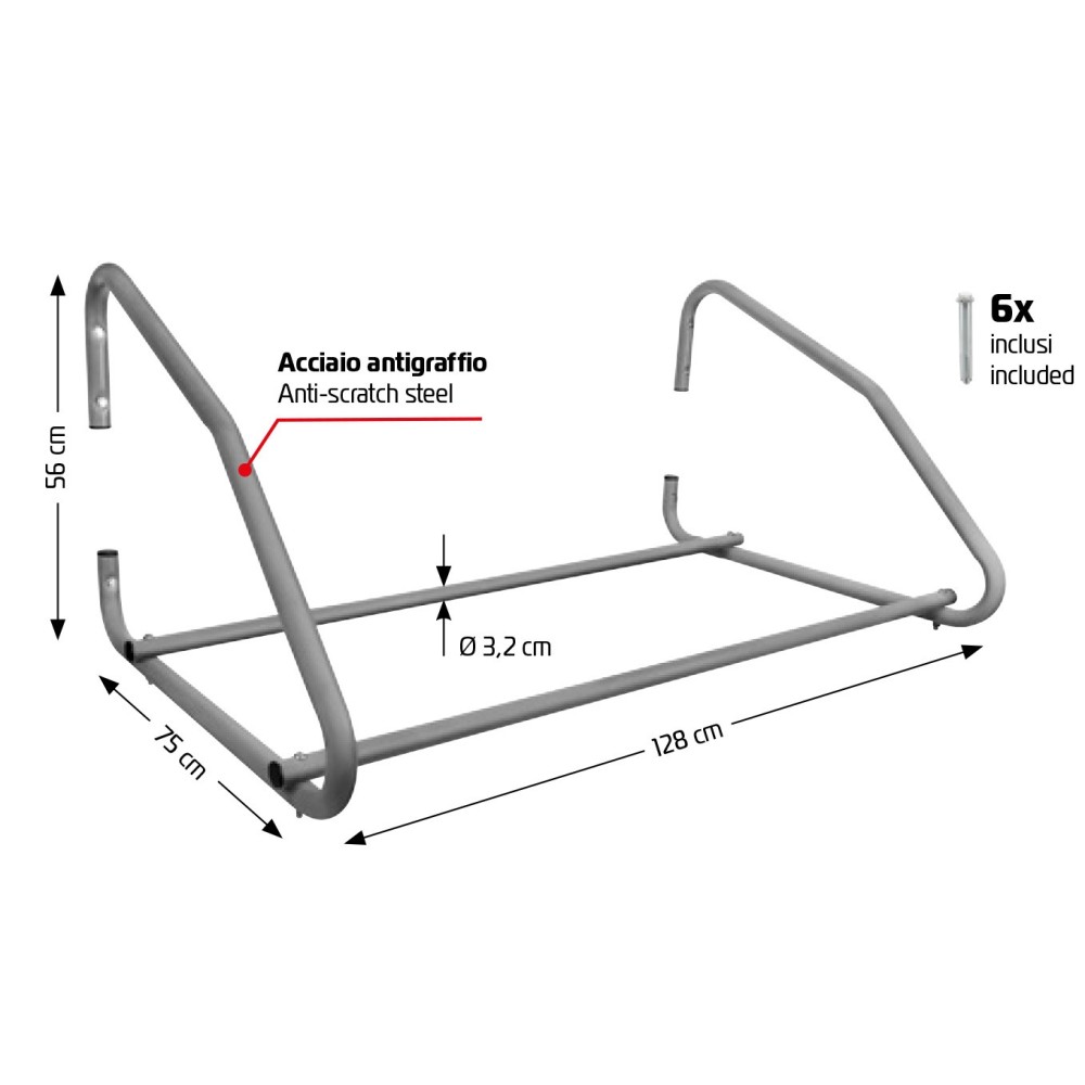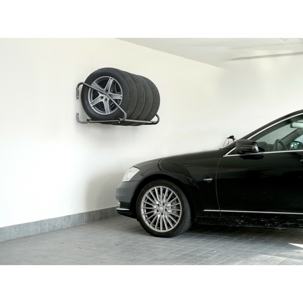 Ideale per il deposito di pneumatici + cerchioni, soli pneumatici o soli cerchioni. Facile da installare, compreso di kit di fissaggio a parete fai da te (6 viti e 6 tasselli per cemento armato). Compatibile per pneumatici da Ø min 530mm a Ø max 765mm. Realizzato In acciaio con verniciatura a polvere, antigraffio e anticorrosione, struttura tubolare tonda (Ø 3,2 cm), delicata sui cerchioni e previene la deformazione dei battistrada