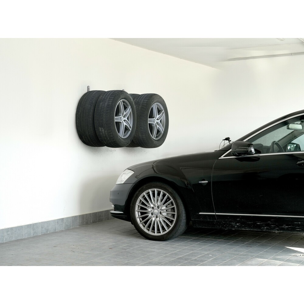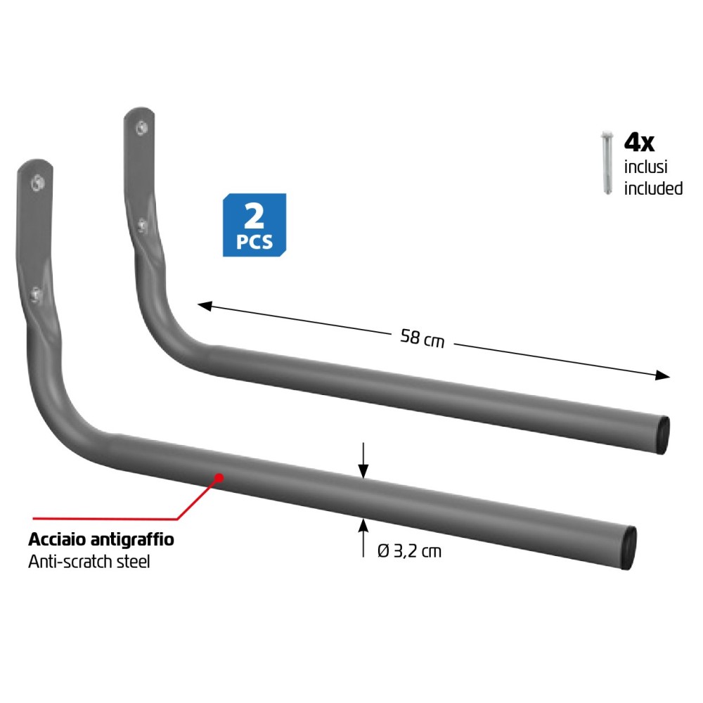 Ideali per il deposito di pneumatici + cerchioni, soli pneumatici o soli cerchioni. Facili da installare, compresi di kit di fissaggio a parete fai da te (4 viti e 4 tasselli per cemento armato). Struttura tubolare tonda (Ø 3,2 cm), delicata sui cerchioni. Realizzati in acciaio con verniciatura a polvere, antigraffio e anticorrosione. Lunghezza 58cm