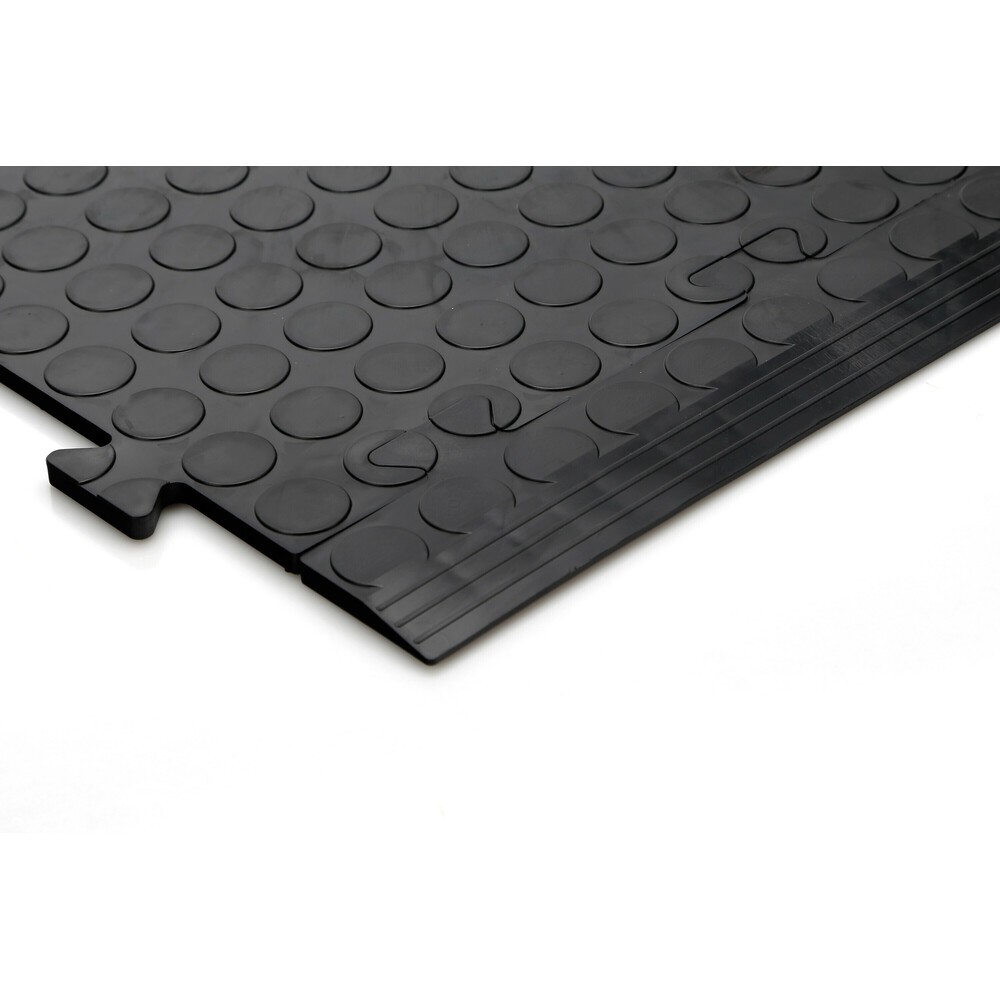 Superficie con disegno in rilievo ''a bolle''. Caratteristiche: morbida, durevole e tenace, facile da pulire, buon isolamento termico e acustico, resistente alla maggior parte di solventi e agenti chimici, riduce danni causati dall'impatto e vibrazioni, antiscivolo, antifatica, semplice da installare e rimuovere, protegge il pavimento sottostante, elimina la polvere dovuto al vecchio pavimento in cemento. Certificazione CSI Cert. Dimensione: 480x70x8 mm