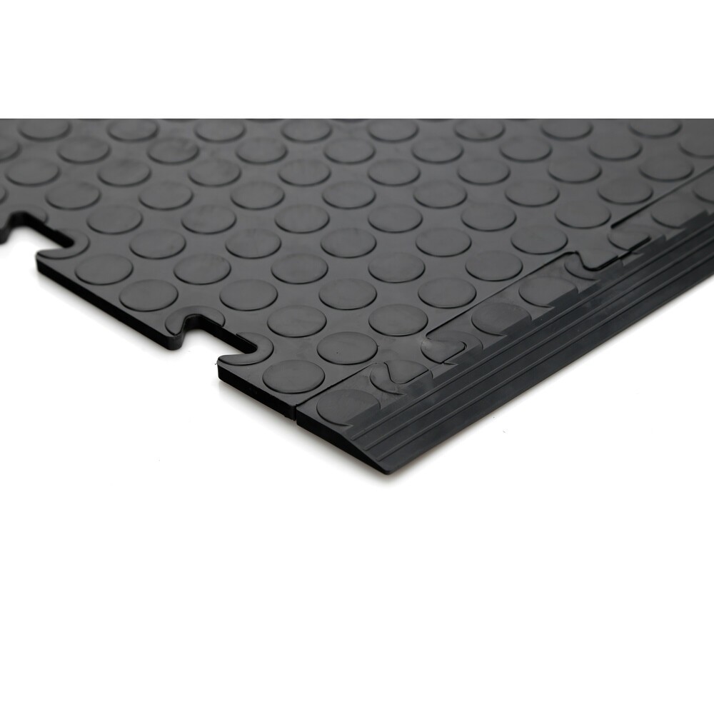 Superficie con disegno in rilievo ''a bolle''. Caratteristiche: morbida, durevole e tenace, facile da pulire, buon isolamento termico e acustico, resistente alla maggior parte di solventi e agenti chimici, riduce danni causati dall'impatto e vibrazioni, antiscivolo, antifatica, semplice da installare e rimuovere, protegge il pavimento sottostante, elimina la polvere dovuto al vecchio pavimento in cemento. Certificazione CSI Cert. Dimensione: 480x51x8 mm