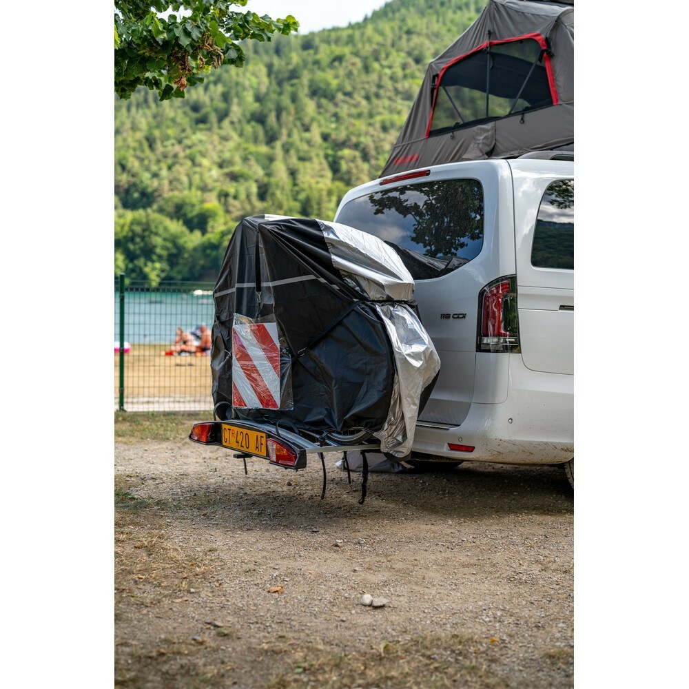 Protegge efficacemente le biciclette durante i viaggi e quando sono posizionate all'esterno. Realizzato in tessuto Oxford 300D con rivestimento PU, impermeabile e resistente agli agenti atmosferici. Ideale per il trasporto fino a 3 biciclette, garantendo sicurezza e comodità. Fissaggio tramite 2 cinghie regolabili con fibbie (440 cm / 270 cm). Tascone trasparente 53 x 53 cm (per cartello carichi sporgenti, non incluso). Striscia riflettente per maggiore visibilità. Borsa di trasporto inclusa. Dimensione: 190x50x130 cm