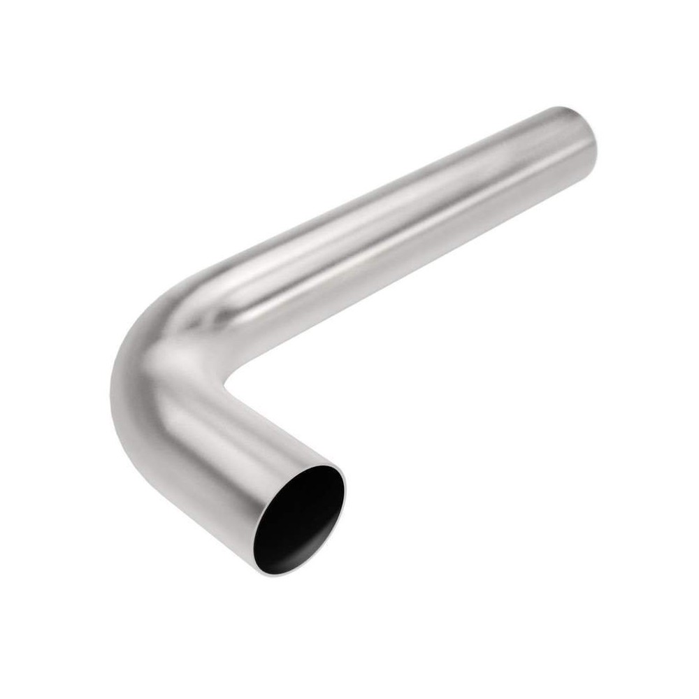 Tubo di raccordo in acciaio inox, curva 90 gradi. Diametro: 3'' - Lunghezza totale: 20.50''. Misura raggio esterno sulla curva: 5''. NOTE: senza fascette
