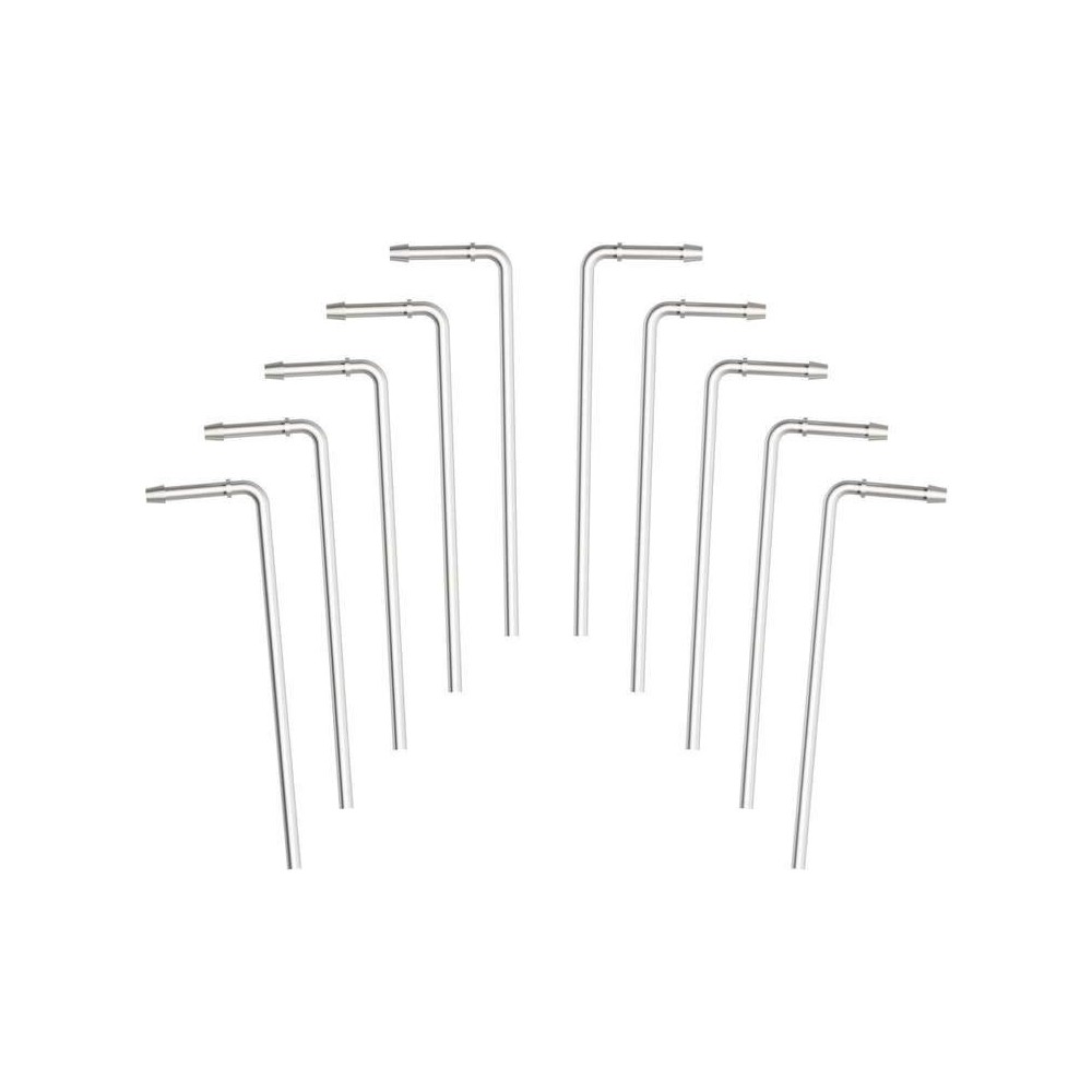 Set 10 ganci in acciao inox per fissaggio silenziatori Magnaflow, versione con curva a 90 gradi. Ogni gancio e' dotato di un'estremita' svasata che assicura lo scarico in posizione. Lunghezza: 10''. Diametro: 0.375''.