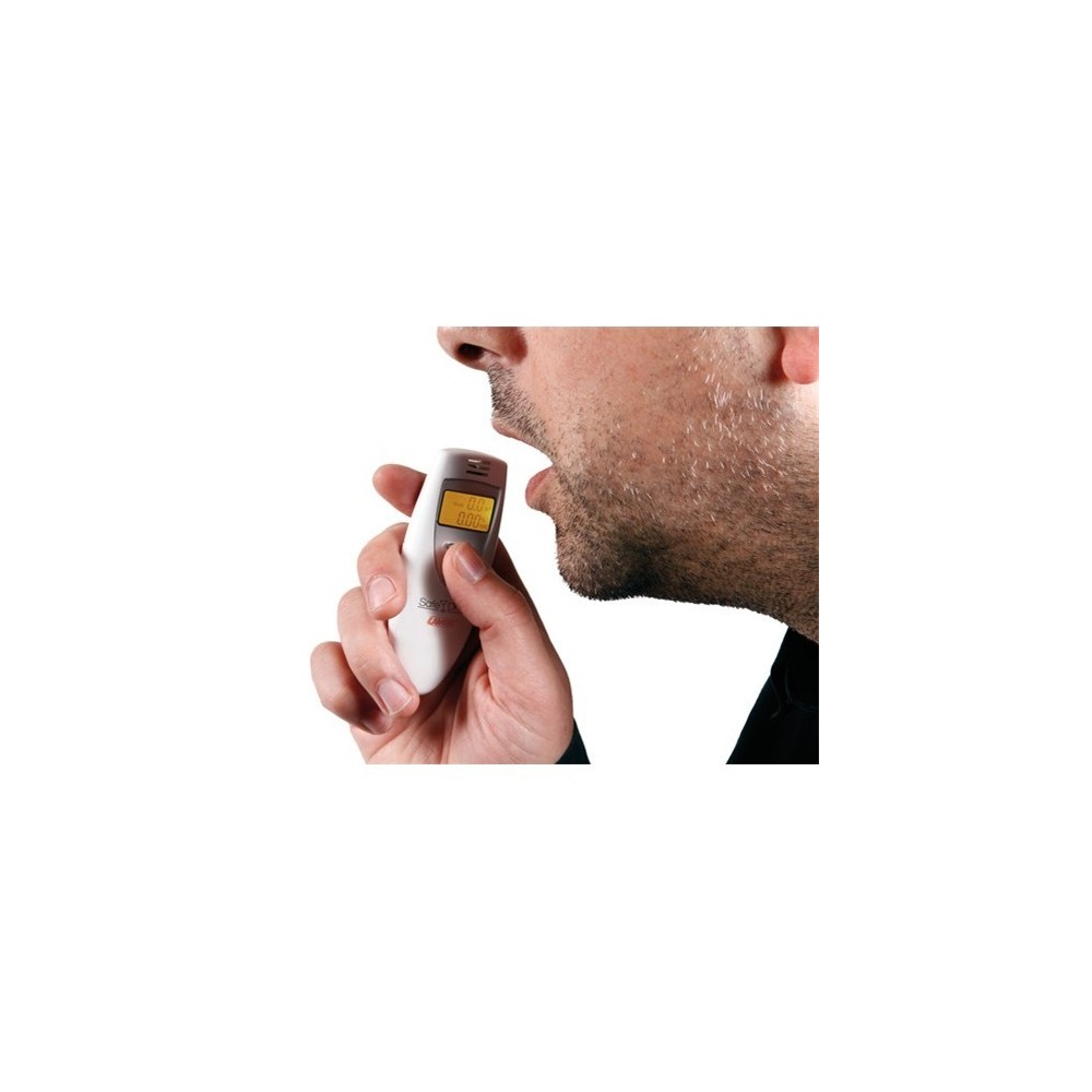 Determina il valore dell'alcool (etanolo) contenuto nel sangue mediante l'analisi dell'aria alveolare espirata. Etilometro con segnale acustico di avvertimento. Sensore: advanced semiconductor oxide alcohol sensor. Range: 0.00-0.19% BAC & 0.0-1.9 g/l (oppure 0.00- 0.95 mg/l BRAC). Precisione: 0,01% BAC (0,1 g/l). Esito veloce e test ripetibile dopo pochi istanti. Autospegnimento: 35 secondi approssimativamente. Funziona con 2 pile ''AAA'' 1,5V alcaline (non incluse). Dimensioni: 95 x 36 x 18 mm.