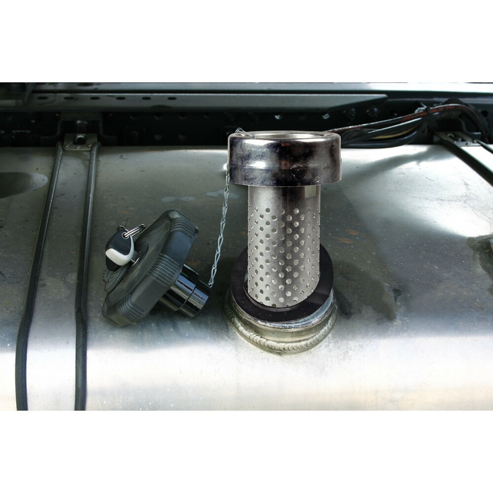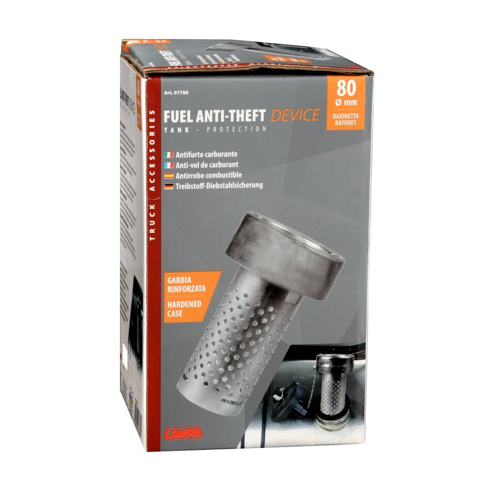 Fissato all'imboccatura del serbatoio carburante, permette l'inserimento della pistola di erogazione, ma previene l'inserimento di tubi o pompe di aspirazione normalmente utilizzate per il furto del carburante. Diametro 80mm (la misura si riferisce al diametro del foro del serbatoio per il quale è compatibile l'antifurto)