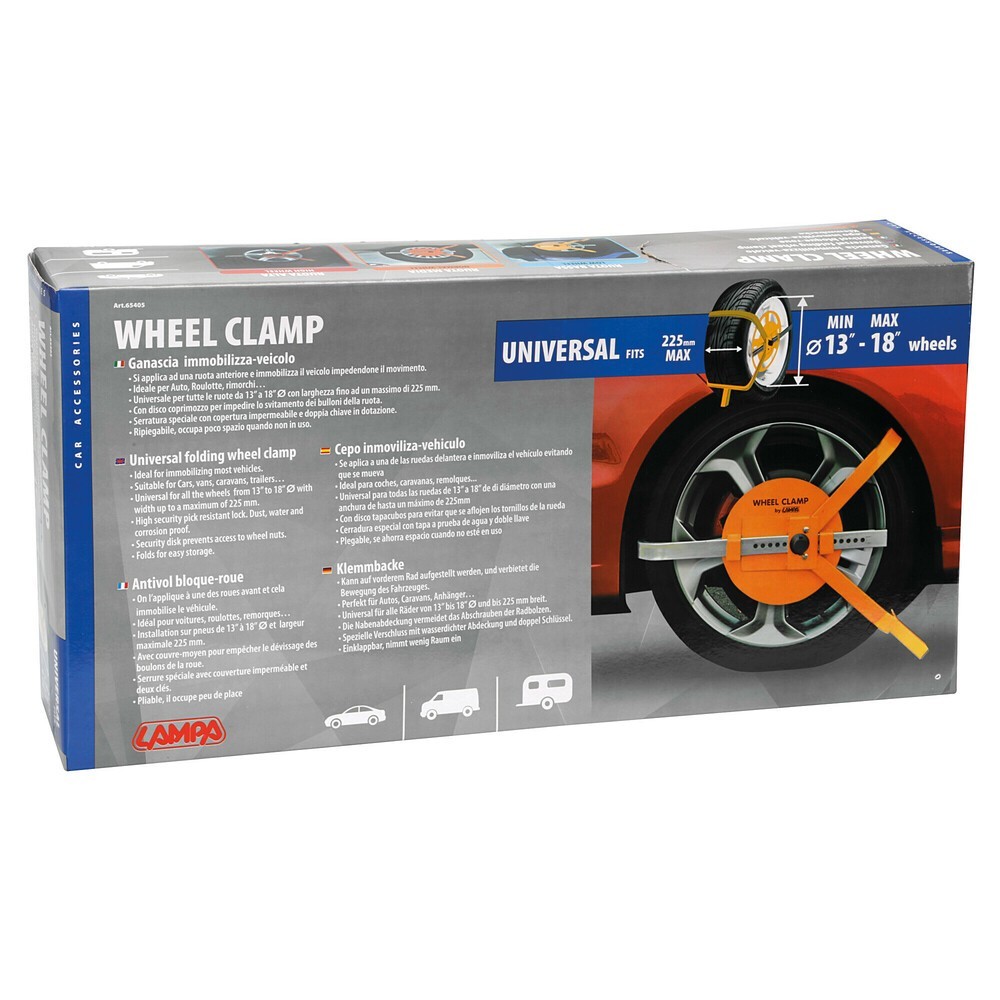 Si applica ad una ruota anteriore e immobilizza il veicolo impedendone il movimento. Ideale per auto, roulotte, rimorchi... Universale per tutte le ruote da diametro 13'' a 18'' con larghezza fino ad un massimo di 225 mm. - Con disco coprimozzo per impedire lo svitamento dei bulloni della ruota (non installabile su pneumatici larghi). Serratura speciale con copertura impermeabile e doppia chiave in dotazione. Ripiegabile, occupa poco spazio quando non in uso.