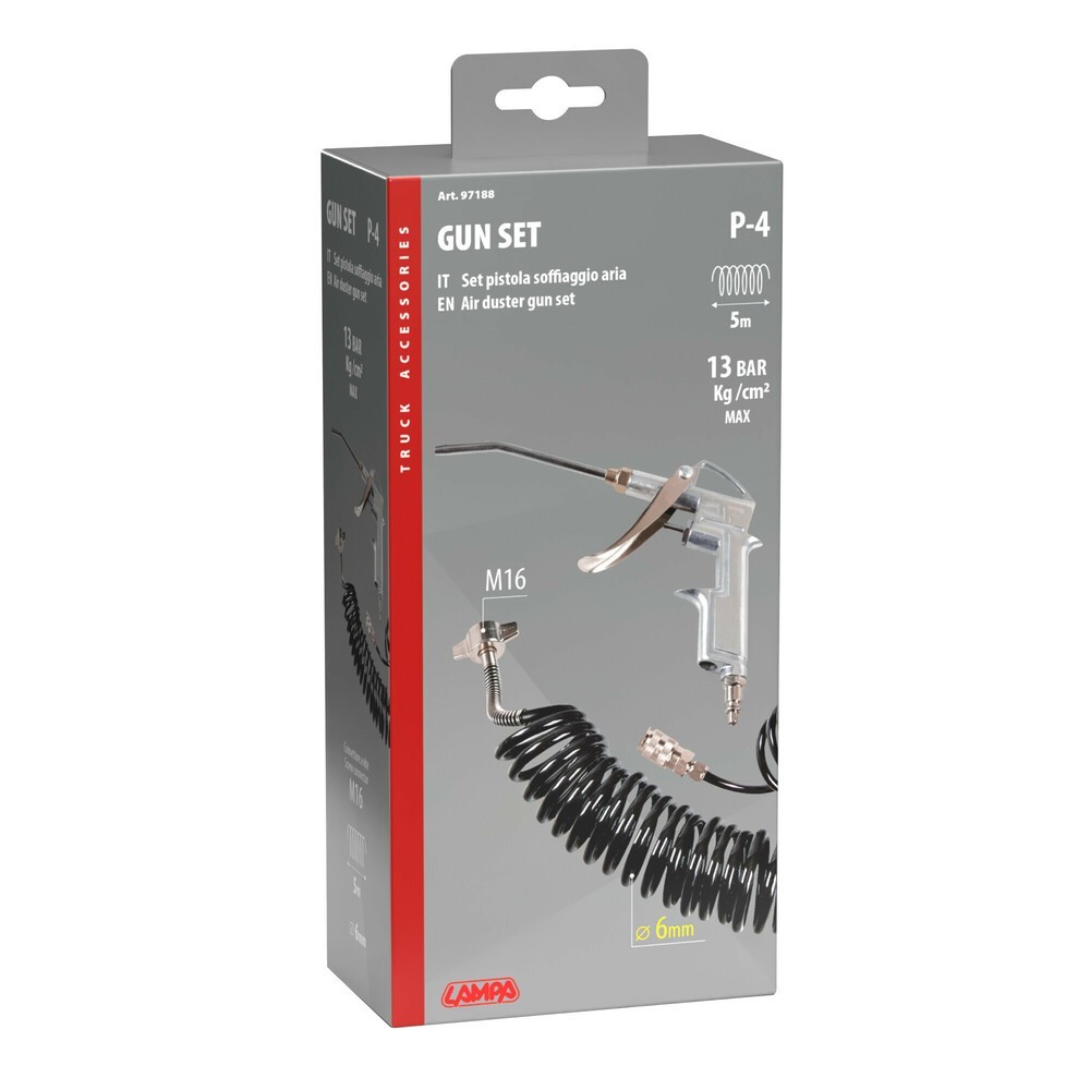 Set pistola aria in metallo appositamente studiato per utilizzo esterno. Tubo a spirale da 5 metri diametro 6 mm. Connettore a vite M16. Pressione massima 10 bar kg/cmq