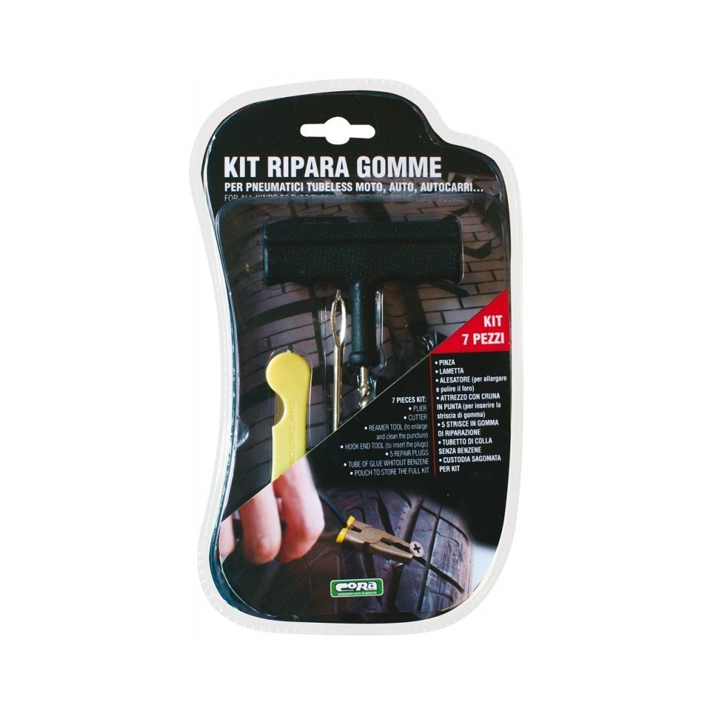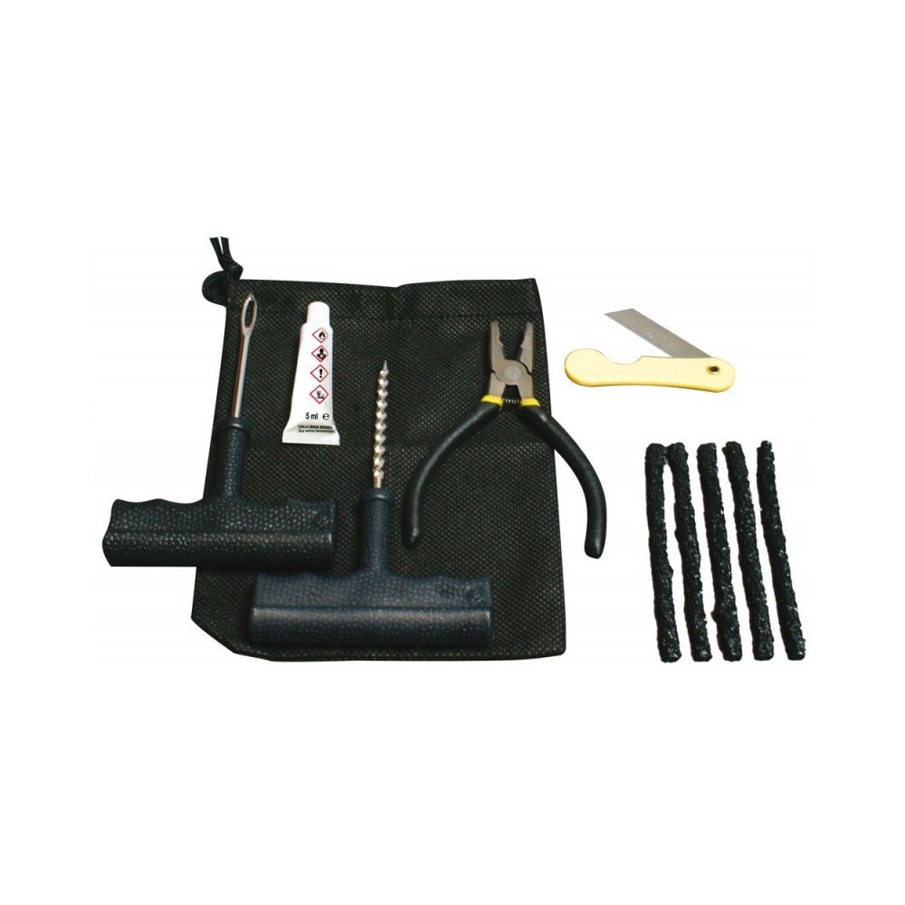 Kit completo per riparare le forature su pneumatici, in modo efficace e duraturo. Adatto a tutti i tipi di pneumatici tubeless. Minimo ingombro grazie alla pratica custodia salvaspazio. Pratico, efficace e sicuro. Di facile e rapido utilizzo, un kit da tenere sempre nel bagagliaio per procedere autonomamente quando e' estremamente pericoloso o non c'e' tempo per sostare troppo in attesa dei soccorsi stradali. CONTENUTO DEL KIT 7 PEZZI: Pinza, Cutter, Alesatore: per allargare e pulire il foro, Punteruolo con cruna in punta per inserire la striscia di gomma, 5 strisce in gomma di riparazione, Tubetto di colla senza benzen