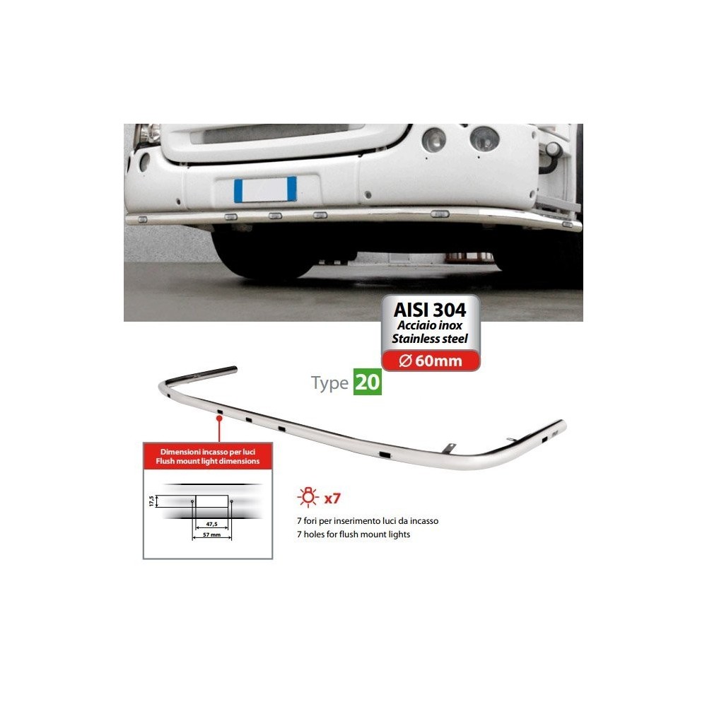 Compatibilita': Scania G Serie 6 - Streamline (400) dal 09/2013> - R Serie 6 - Streamline (400) dal 09/2013 al 12/2017. Barra sotto paraurti con 7 fori per inserimento luci da incasso. Realizzata utilizzando tubi in acciaio INOX AISI 304 con diametro 60mm e spessore 1,2mm. Finite con un'accurata lucidatura a specchio eseguita manualmente su ogni singolo particolare e saldatura. Accessori e viti per il montaggio inclusi