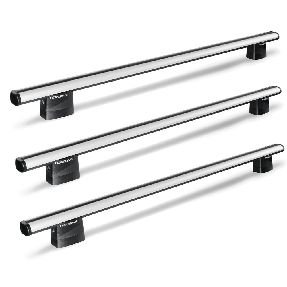Compatibilita': Volkswagen LT dal 2000 al 2006 tetto H3 (alto). Kit 3 barre portatutto lunghezza 180cm + attacchi specifici marca Nordrive per veicoli commerciali con grondina, in alluminio anodizzato dotato di 3 scanalature predisposte per l'inserimento di accessori tramite i connettori ''T''. Sezione barra: 54x39mm. Le uniche omologate per portaggio max 150Kg.