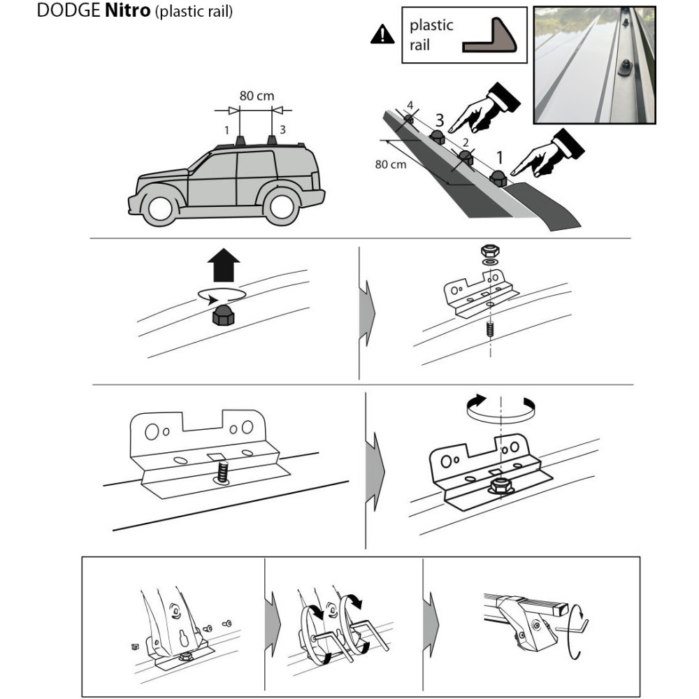 Compatibilita': Dodge Nitro 5 porte ( con corrimano in plastica ) immatricolata dal 2008. Coppia di barre portatutto LP64 prodotte dall'azienda italiana Prealpina leader europeo, con solida struttura portante in profilato d'acciaio, inguainato in PVC antiscivolo - antigraffio. Attacchi in lamiera di acciaio stampata e verniciata con polveri termoindurenti ''long life'' anticorrosione. Terminale copri-attacchi realizzato in ABS, senza serratura. Portata: max 75kg ( a seconda del tipo di fissaggio ). Sezione barre: 34x23mm