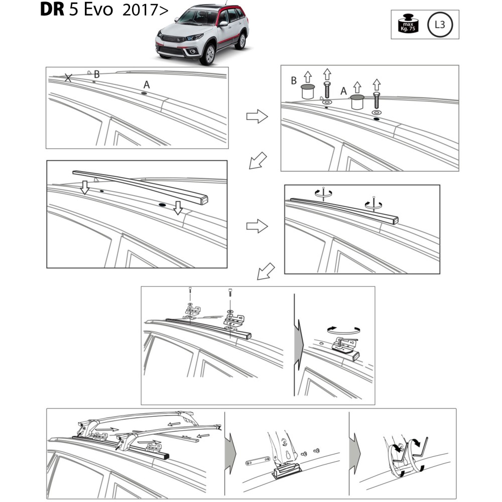 Compatibilita': Dr DR5 (Evo 5 porte con corrimano basso) immatricolata dal 2017>. Coppia di barre portatutto LP64 prodotte dall'azienda italiana Prealpina leader europeo, con solida struttura portante in profilato d'acciaio, inguainato in PVC antiscivolo - antigraffio. Attacchi in lamiera di acciaio stampata e verniciata con polveri termoindurenti ''long life'' anticorrosione. Terminale copri-attacchi realizzato in ABS, senza serratura. Portata: max 75kg ( a seconda del tipo di fissaggio ). Sezione barre: 34x23mm
