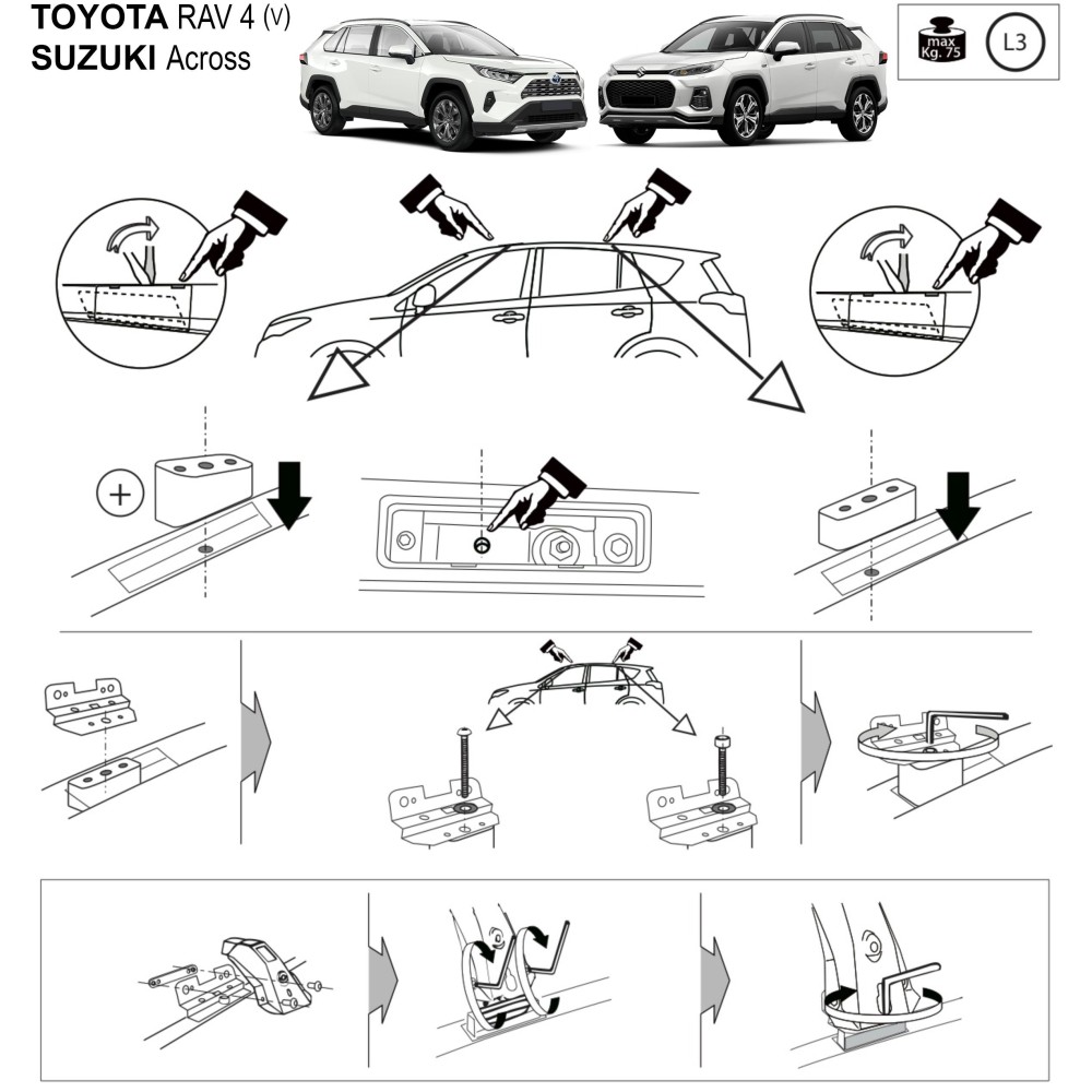 Compatibilita': Suzuki Across dal 2020 ( fissaggio nei punti fissi dei profili ). Coppia di barre portatutto LP64 prodotte dall'azienda italiana Prealpina leader europeo, con solida struttura portante in profilato d'acciaio, inguainato in PVC antiscivolo - antigraffio. Attacchi in lamiera di acciaio stampata e verniciata con polveri termoindurenti ''long life'' anticorrosione. Terminale copri-attacchi realizzato in ABS, senza serratura. Portata: max 75kg ( a seconda del tipo di fissaggio ). Sezione barre: 34x23mm