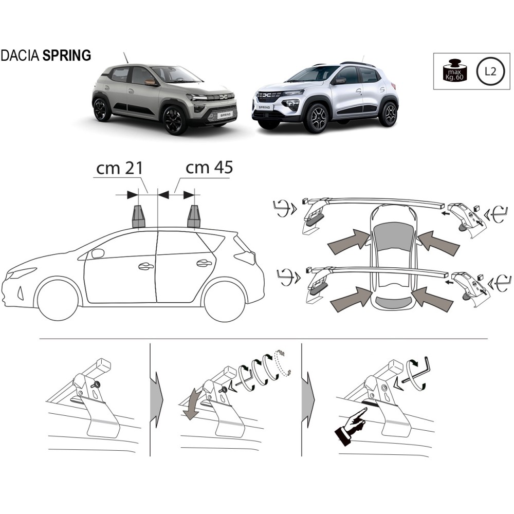 Compatibilita': Dacia Spring (con e senza railing, montaggio su carrozzeria) immatricolata dal 2021>. Coppia di barre portatutto LP49 prodotte dall'azienda italiana Prealpina leader europeo, con struttura completamente in lega di alluminio + Kit di attacchi specifici per auto. Barra areodinamica con piano di carico rivestito in PVC antiscivolo - antigraffio. Attacchi in lamiera di acciaio stampata e verniciata con polveri termoindurenti ''long life'' anticorrosione. Terminale copri attacchi realizzato in ABS e dotato di serratura a chiave. Portata: max 60kg ( a seconda del tipo di fissaggio ). Sezione: 59x30mm