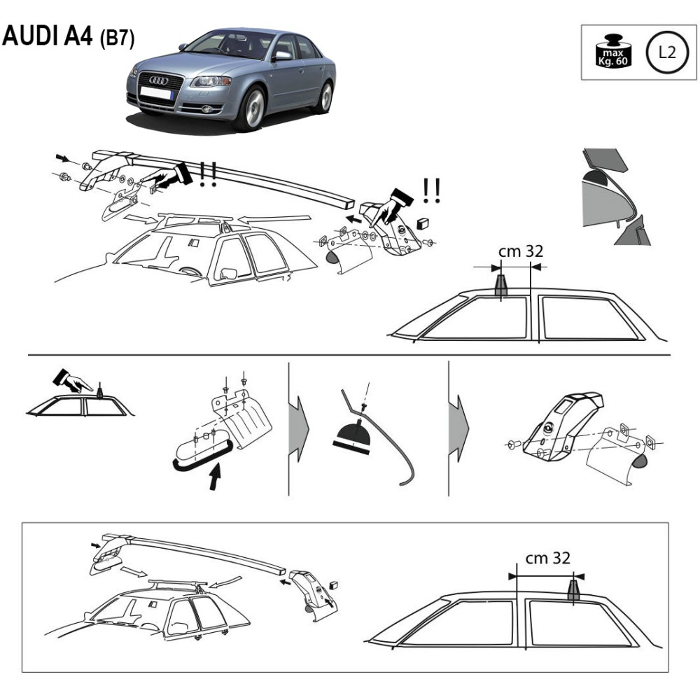 Compatibilita': Audi A4 Berlina (terza serie) immatricolata dal 2004 al 2008. Coppia di barre portatutto LP47 prodotte dall'azienda italiana Prealpina leader europeo, con solida struttura portante in profilato d'acciaio, inguainato in PVC antiscivolo - antigraffio. Attacchi in lamiera di acciaio stampata e verniciata con polveri termoindurenti ''long life'' anticorrosione. Portata: max 75kg ( a seconda del tipo di fissaggio ). Sezione barre: 34x23mm. Terminale copri-attacchi realizzato in ABS incluso.