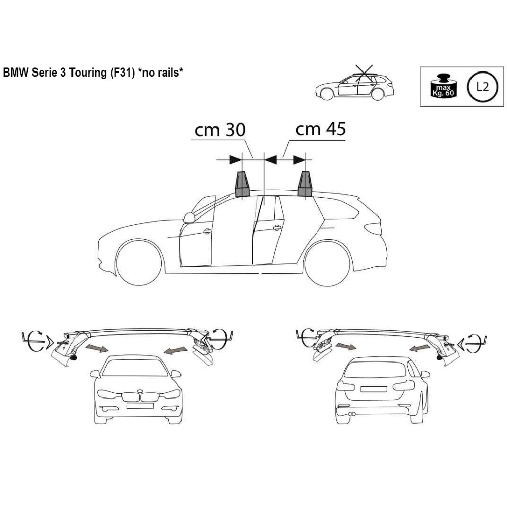 Compatibilita': Bmw Serie 3 Touring SW (F31) senza corrimano/profili dal 06/2012 al 07/2019. Coppia di barre portatutto LP47 prodotte dall'azienda italiana Prealpina leader europeo, con solida struttura portante in profilato d'acciaio, inguainato in PVC antiscivolo - antigraffio. Attacchi in lamiera di acciaio stampata e verniciata con polveri termoindurenti ''long life'' anticorrosione. Portata: max 75kg ( a seconda del tipo di fissaggio ). Sezione barre: 34x23mm. Terminale copri-attacchi realizzato in ABS incluso.