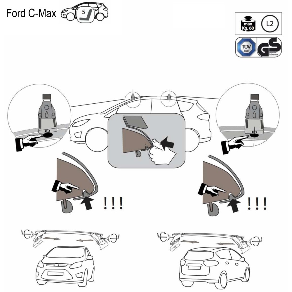 Compatibilita': Ford C-Max Monovolume 5 posti ( senza corrimano ) immatricolata dal 2010. Coppia di barre portatutto LP47 prodotte dall'azienda italiana Prealpina leader europeo, con solida struttura portante in profilato d'acciaio, inguainato in PVC antiscivolo - antigraffio. Attacchi in lamiera di acciaio stampata e verniciata con polveri termoindurenti ''long life'' anticorrosione. Portata: max 75kg ( a seconda del tipo di fissaggio ). Lunghezza barre: 124cm, Sezione barre: 34x23mm. Terminale copri-attacchi realizzato in ABS incluso.