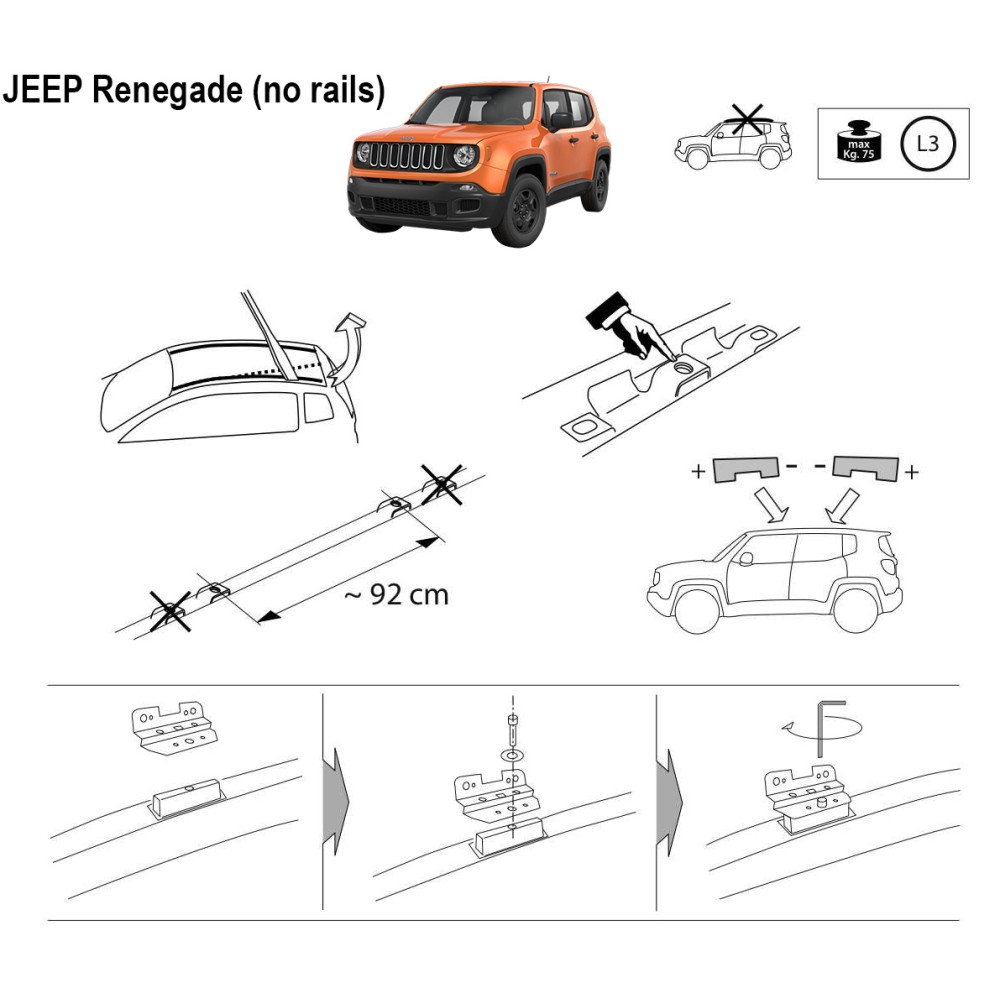 Compatibilita': Jeep Renegade (senza corrimano / railing) dal 2014>. Coppia di barre portatutto LP64 prodotte dall'azienda italiana Prealpina leader europeo, con solida struttura portante in profilato d'acciaio, inguainato in PVC antiscivolo - antigraffio. Attacchi in lamiera di acciaio stampata e verniciata con polveri termoindurenti ''long life'' anticorrosione. Terminale copri-attacchi realizzato in ABS, senza serratura. Portata: max 75kg ( a seconda del tipo di fissaggio ). Sezione barre: 34x23mm