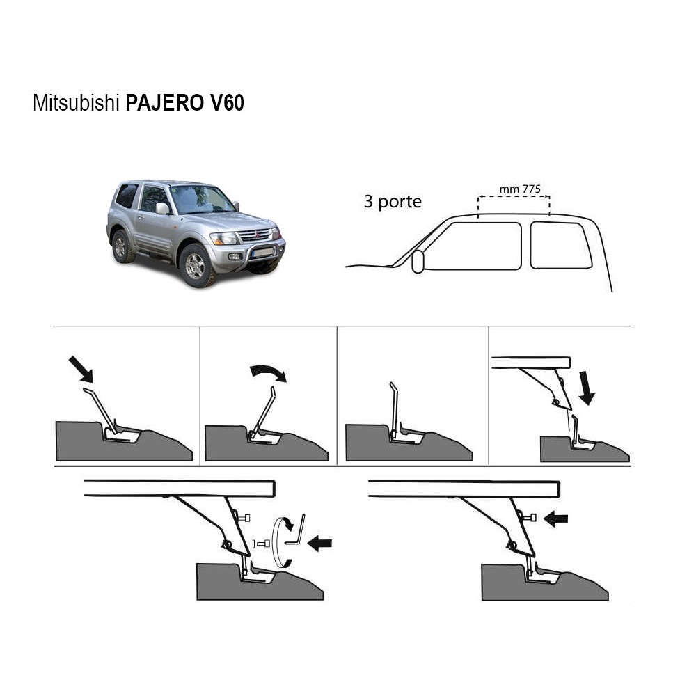 Compatibilita': Mitsubishi Pajero V60 (con predisposizioni) immatricolata dal 2000 al 2006. Coppia di barre portatutto con struttura in alluminio + kit di attacchi specifici per auto. Le barre LP56 sono prodotte dall'azienda italiana La Prealpina, leader Europeo nella produzione di barre portatutto, portabici e portasci per ogni tipo di veicolo. Le barre sono di facile montaggio e sono complete di antifurto con chiave. Attacchi specifici per auto con predisposizioni sul tetto o con corrimano integrati. Portata: max 75kg ( a seconda del tipo di fissaggio ). Sezione barre: 59x30mm