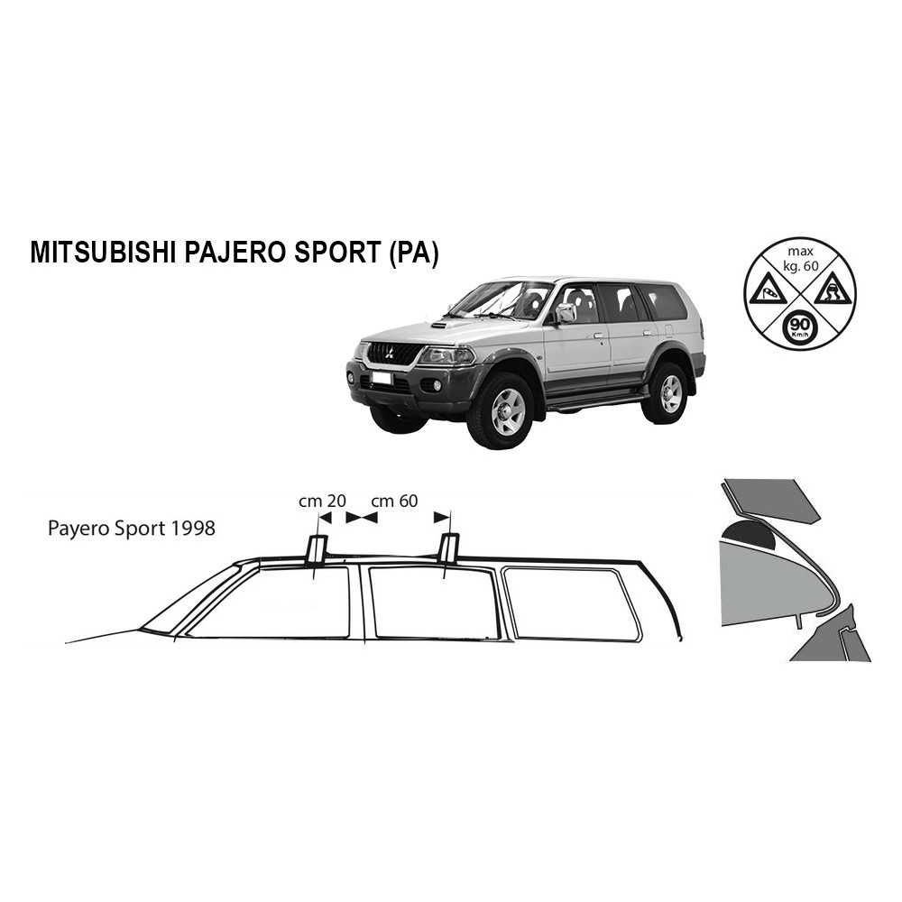 Compatibilita': Mitsubishi Pajero Sport (PA) montaggio esterno (non nelle grondine) dal 1998 al 2008. Coppia di barre portatutto LP47 prodotte dall'azienda italiana Prealpina leader europeo, con solida struttura portante in profilato d'acciaio, inguainato in PVC antiscivolo - antigraffio. Attacchi in lamiera di acciaio stampata e verniciata con polveri termoindurenti ''long life'' anticorrosione. Portata: max 75kg ( a seconda del tipo di fissaggio ). Sezione barre: 34x23mm. Terminale copri-attacchi realizzato in ABS incluso.