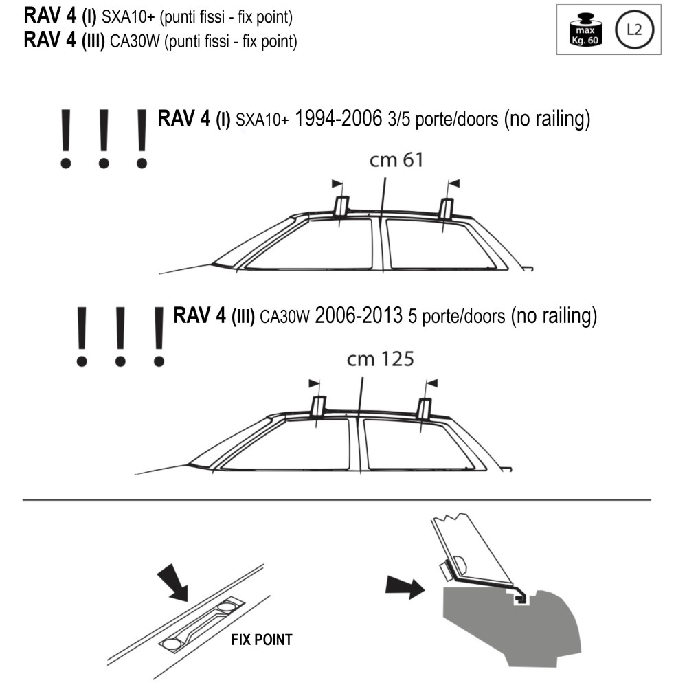 Compatibilita': Toyota Rav4 3/5 porte ( senza corrimano ) immatricolata dal 1994 al 2000. Coppia di barre portatutto LP43 prodotte dall'azienda italiana Prealpina leader europeo, con struttura completamente in lega di alluminio + Kit di attacchi specifici per auto. Attacchi in lamiera di acciaio stampata e verniciata con polveri termoindurenti ''long life'' anticorrosione. Terminale copri attacchi realizzato in ABS e dotato di serratura a chiave. Portata: max 75kg ( a seconda del tipo di fissaggio ). Sezione barre: 32x22mm
