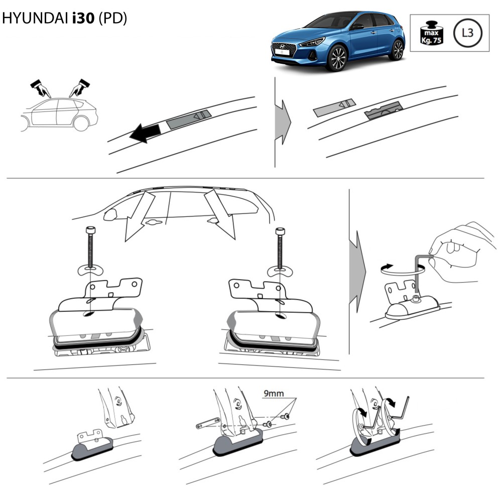 Compatibilita': Hyundai i30 5 porte ( senza corrimano ) immatricolata dal 2017. Coppia di barre portatutto LP64 prodotte dall'azienda italiana Prealpina leader europeo, con solida struttura portante in profilato d'acciaio, inguainato in PVC antiscivolo - antigraffio. Attacchi in lamiera di acciaio stampata e verniciata con polveri termoindurenti ''long life'' anticorrosione. Terminale copri-attacchi realizzato in ABS, senza serratura. Portata: max 75kg ( a seconda del tipo di fissaggio ). Sezione barre: 34x23mm