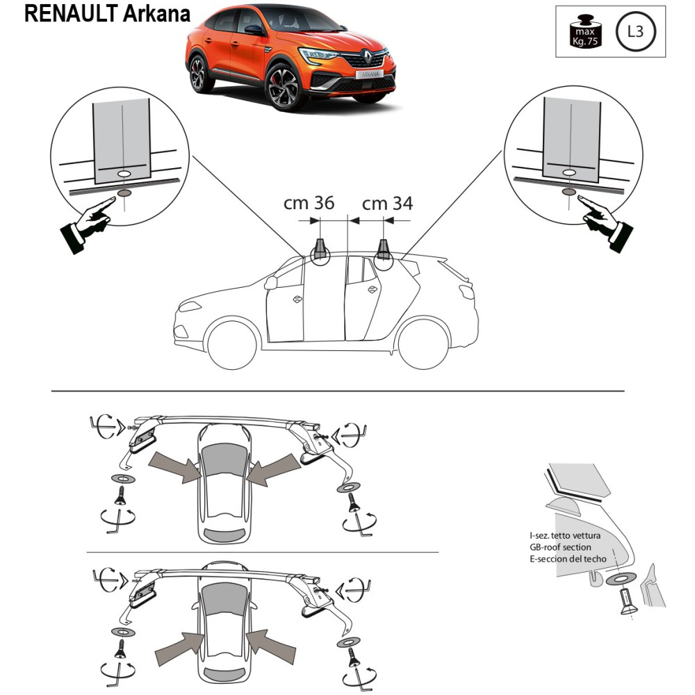 Compatibilita': Renault Arkana (senza railing) immatricolata dal 2020>. Coppia di barre portatutto LP47 prodotte dall'azienda italiana Prealpina leader europeo, con solida struttura portante in profilato d'acciaio, inguainato in PVC antiscivolo - antigraffio. Attacchi in lamiera di acciaio stampata e verniciata con polveri termoindurenti ''long life'' anticorrosione. Portata: max 75kg ( a seconda del tipo di fissaggio ). Sezione barre: 34x23mm. Terminale copri-attacchi realizzato in ABS incluso.