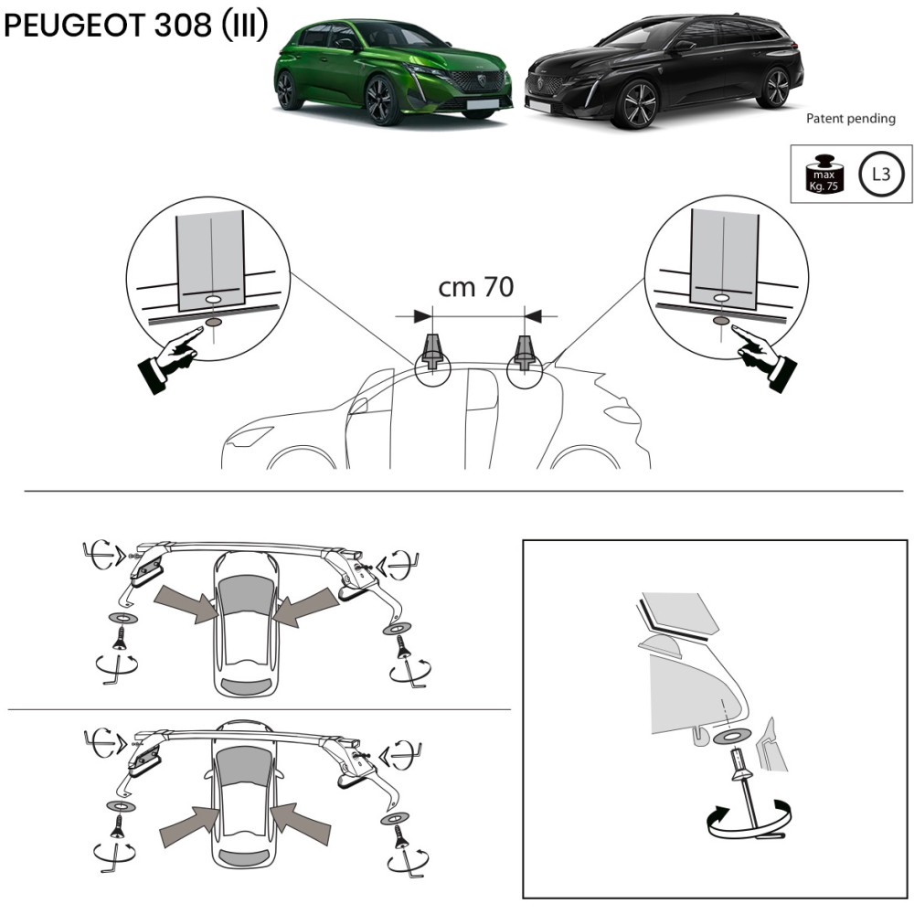 Compatibilita': Peugeot 308 (III) berlina/station wagon (senza corrimano / railing) immatricolata dal 2021>. Coppia di barre portatutto LP47 prodotte dall'azienda italiana Prealpina leader europeo, con solida struttura portante in profilato d'acciaio, inguainato in PVC antiscivolo - antigraffio. Attacchi in lamiera di acciaio stampata e verniciata con polveri termoindurenti ''long life'' anticorrosione. Portata: max 75kg ( a seconda del tipo di fissaggio ). Sezione barre: 34x23mm. Terminale copri-attacchi realizzato in ABS incluso.