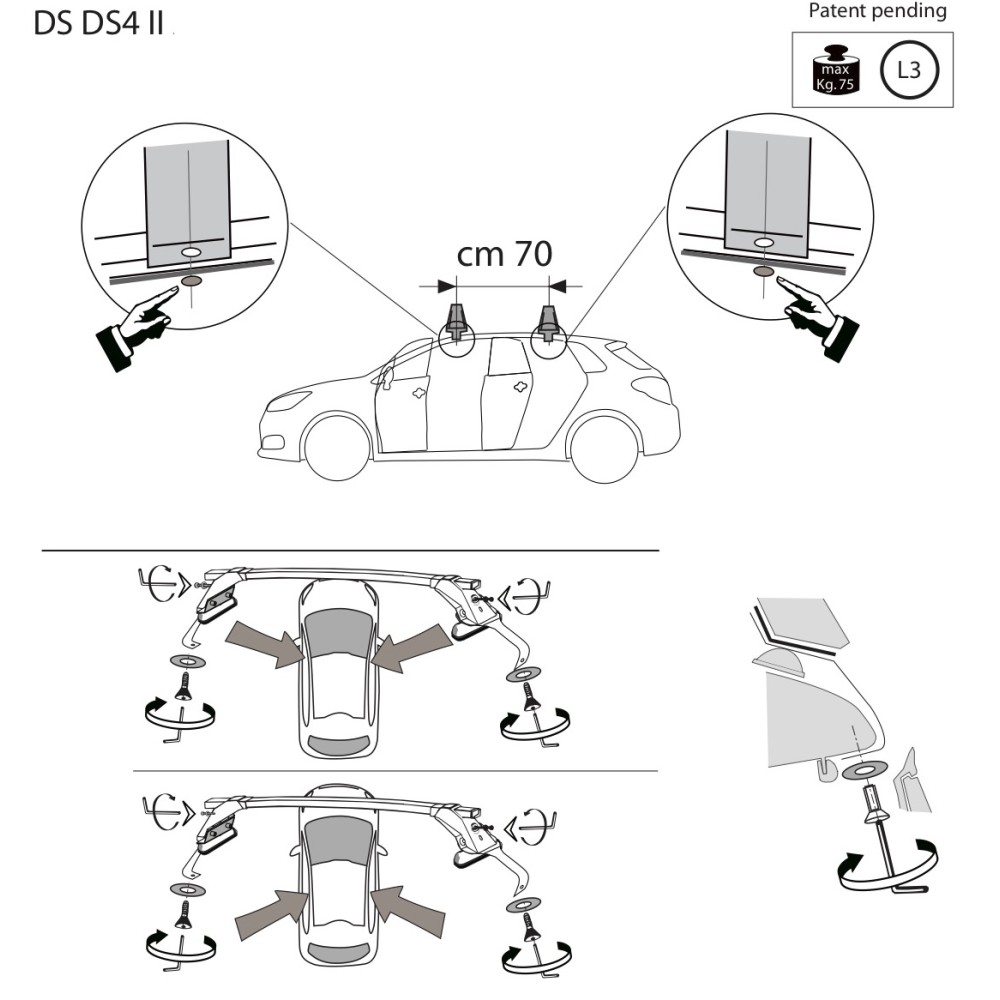 Compatibilita': DS 4 (II) immatricolata dal 2021>. Coppia di barre portatutto LP47 prodotte dall'azienda italiana Prealpina leader europeo, con solida struttura portante in profilato d'acciaio, inguainato in PVC antiscivolo - antigraffio. Attacchi in lamiera di acciaio stampata e verniciata con polveri termoindurenti ''long life'' anticorrosione. Portata: max 75kg ( a seconda del tipo di fissaggio ). Sezione barre: 34x23mm. Terminale copri-attacchi realizzato in ABS incluso.