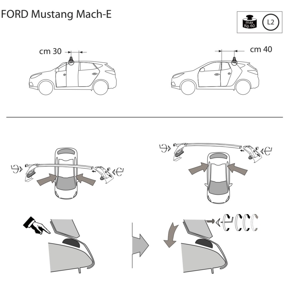Compatibilita': Ford Mustang Mach-E immatricolata dal 2020>. Coppia di barre portatutto LP47 prodotte dall'azienda italiana Prealpina leader europeo, con solida struttura portante in profilato d'acciaio, inguainato in PVC antiscivolo - antigraffio. Attacchi in lamiera di acciaio stampata e verniciata con polveri termoindurenti ''long life'' anticorrosione. Portata: max 75kg ( a seconda del tipo di fissaggio ). Sezione barre: 34x23mm. Terminale copri-attacchi realizzato in ABS incluso.
