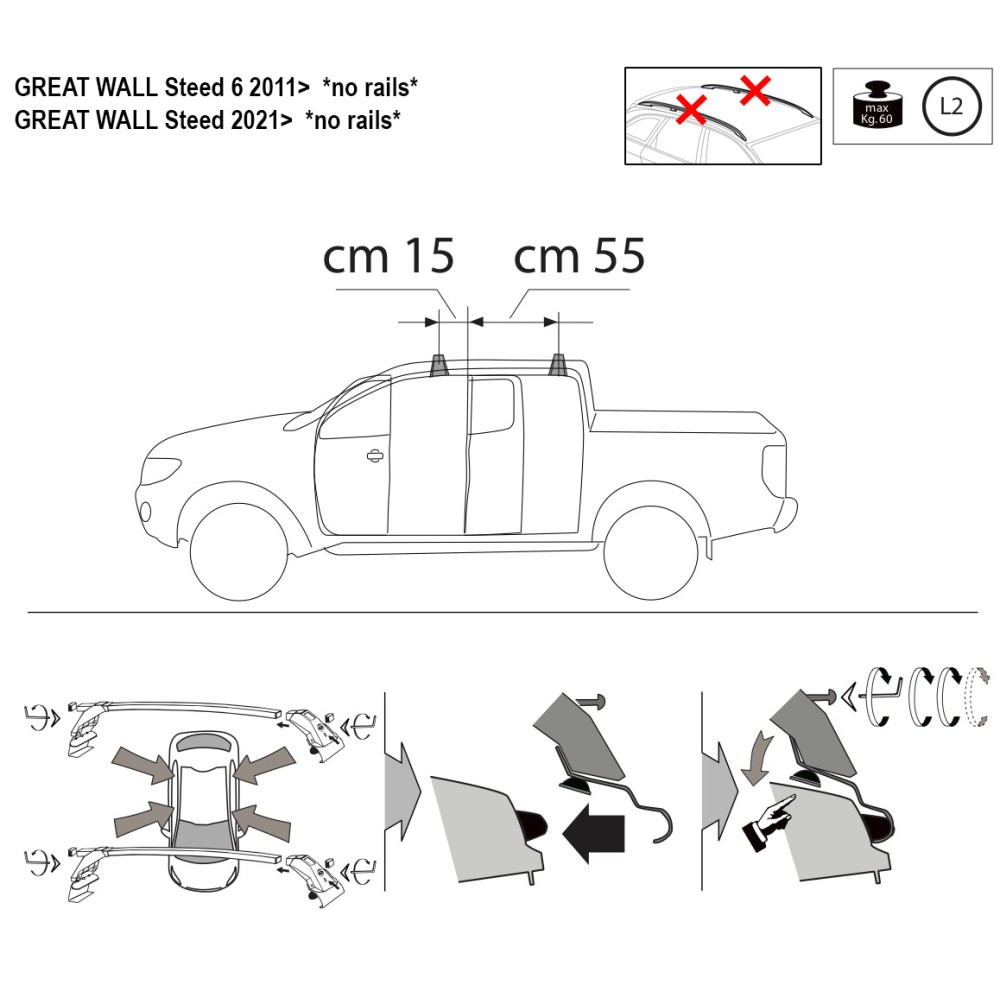 Compatibilita': Great Wall Steed senza corrimano / railing dal 2011> (anche versione dal 2021>). Coppia di barre portatutto LP47 prodotte dall'azienda italiana Prealpina leader europeo, con solida struttura portante in profilato d'acciaio, inguainato in PVC antiscivolo - antigraffio. Attacchi in lamiera di acciaio stampata e verniciata con polveri termoindurenti ''long life'' anticorrosione. Portata: max 75kg ( a seconda del tipo di fissaggio ). Sezione barre: 34x23mm. Terminale copri-attacchi realizzato in ABS incluso.