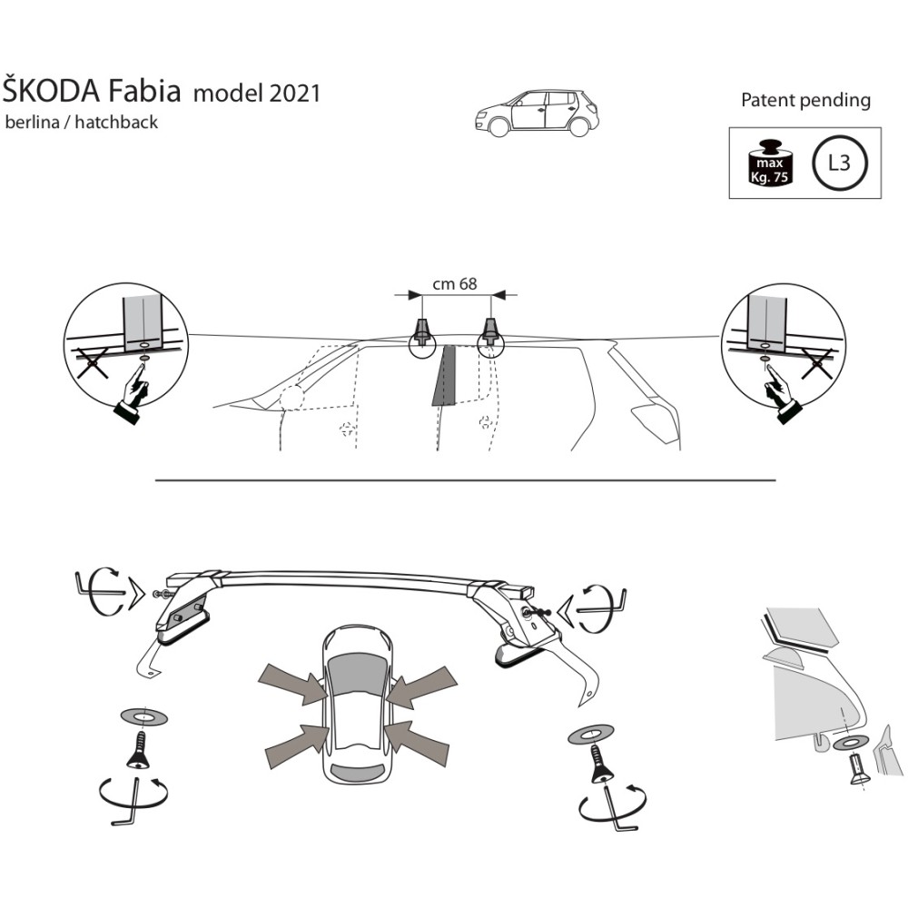 Compatibilita': Skoda Fabia (IV) senza corrimano / railing immatricolata dal 2021>. Coppia di barre portatutto LP47 prodotte dall'azienda italiana Prealpina leader europeo, con solida struttura portante in profilato d'acciaio, inguainato in PVC antiscivolo - antigraffio. Attacchi in lamiera di acciaio stampata e verniciata con polveri termoindurenti ''long life'' anticorrosione. Portata: max 75kg ( a seconda del tipo di fissaggio ). Sezione barre: 34x23mm. Terminale copri-attacchi realizzato in ABS incluso.