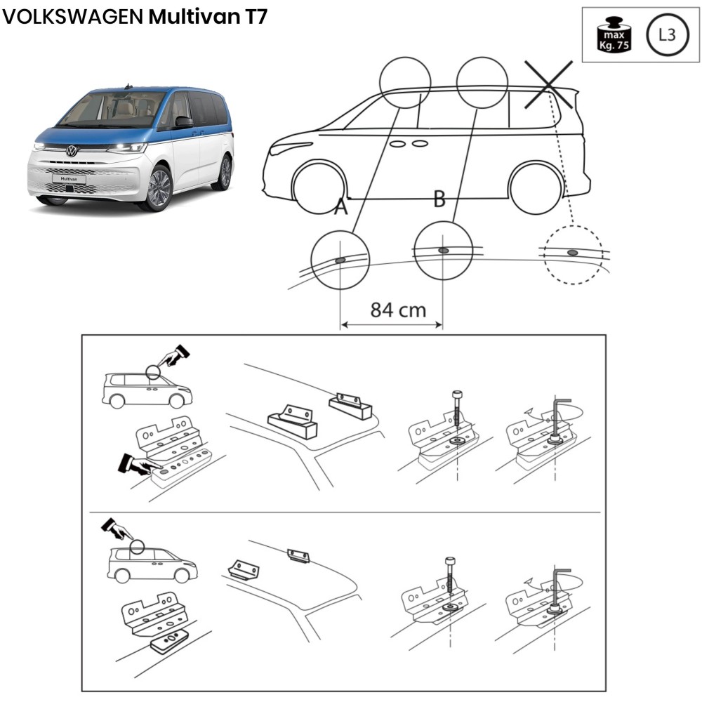 Compatibilita': Volkswagen Transporter Multivan (T7) immatricolata dal 2022>. Coppia di barre portatutto LP64 prodotte dall'azienda italiana Prealpina leader europeo, con solida struttura portante in profilato d'acciaio, inguainato in PVC antiscivolo - antigraffio. Attacchi in lamiera di acciaio stampata e verniciata con polveri termoindurenti ''long life'' anticorrosione. Terminale copri-attacchi realizzato in ABS, senza serratura. Portata: max 75kg ( a seconda del tipo di fissaggio ). Sezione barre: 34x23mm