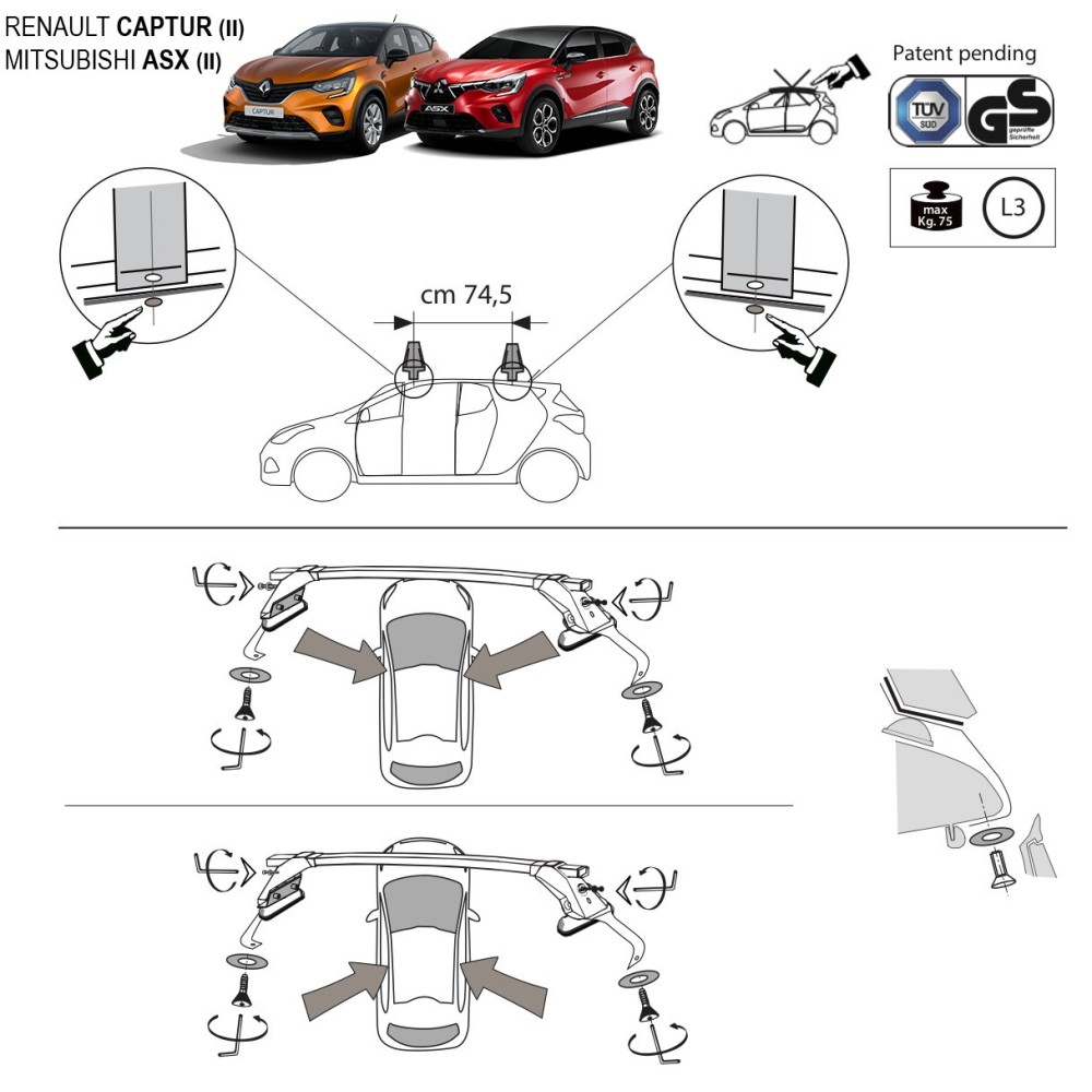 Compatibilita': Mitsubishi ASX (II) senza profili/railing dal 12/2023>. Coppia di barre portatutto LP43 prodotte dall'azienda italiana Prealpina leader europeo, con struttura completamente in lega di alluminio + Kit di attacchi specifici per auto. Attacchi in lamiera di acciaio stampata e verniciata con polveri termoindurenti ''long life'' anticorrosione. Terminale copri attacchi realizzato in ABS e dotato di serratura a chiave. Portata: max 75kg ( a seconda del tipo di fissaggio ). Sezione barre: 32x22mm
