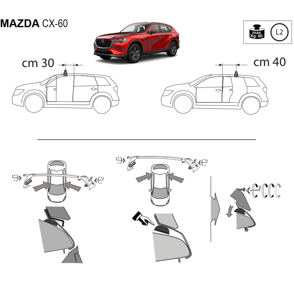 Compatibilita': Mazda CX-60 dal 2022>. Coppia di barre portatutto LP47 prodotte dall'azienda italiana Prealpina leader europeo, con solida struttura portante in profilato d'acciaio, inguainato in PVC antiscivolo - antigraffio. Attacchi in lamiera di acciaio stampata e verniciata con polveri termoindurenti ''long life'' anticorrosione. Portata: max 60kg. Sezione barre: 34x23mm. Terminale copri-attacchi realizzato in ABS incluso.