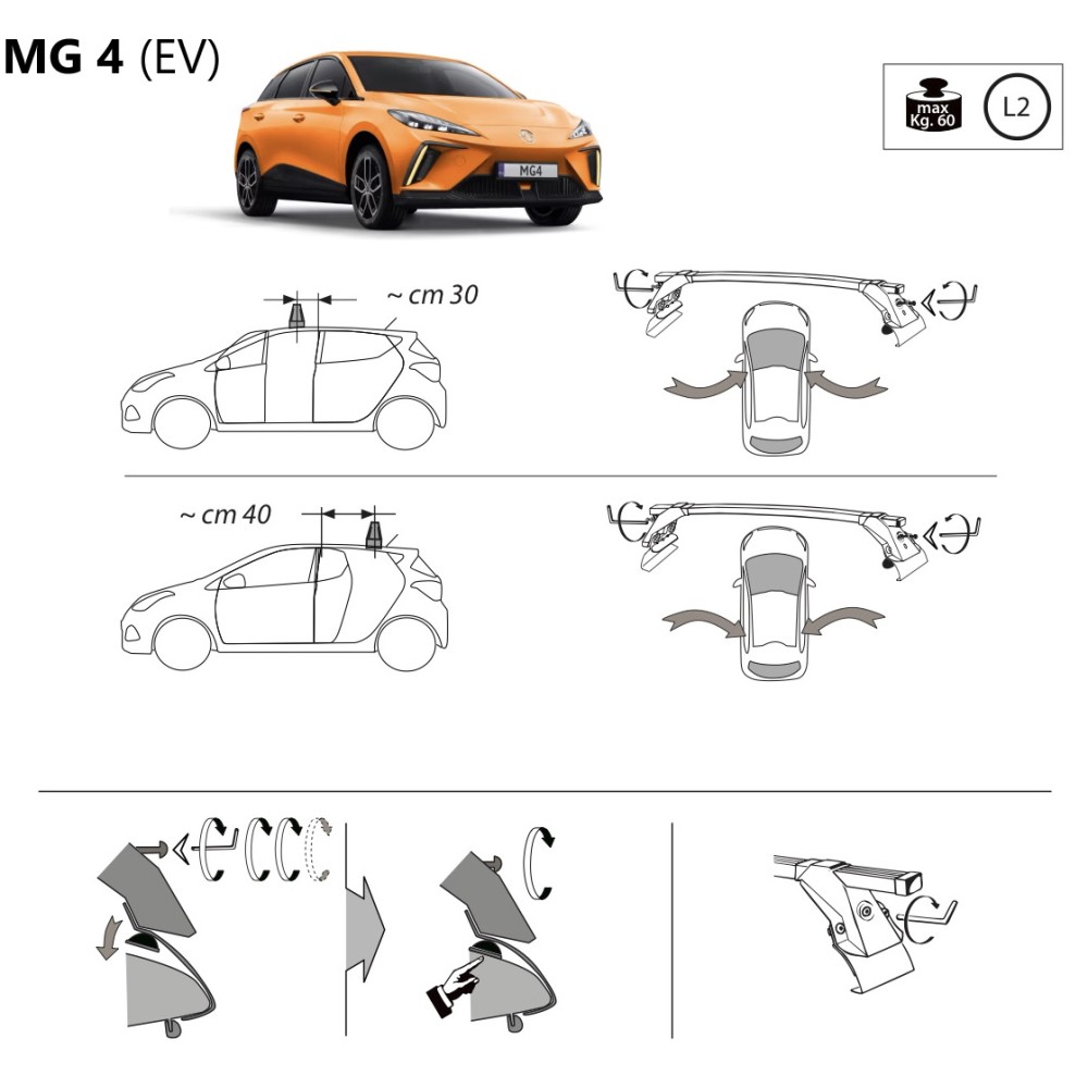 Compatibilita': MG 4 (EV) immatricolata dal 2022>. Coppia di barre portatutto LP47 prodotte dall'azienda italiana Prealpina leader europeo, con solida struttura portante in profilato d'acciaio, inguainato in PVC antiscivolo - antigraffio. Attacchi in lamiera di acciaio stampata e verniciata con polveri termoindurenti ''long life'' anticorrosione. Portata: max 60kg. Sezione barre: 34x23mm. Terminale copri-attacchi realizzato in ABS incluso.
