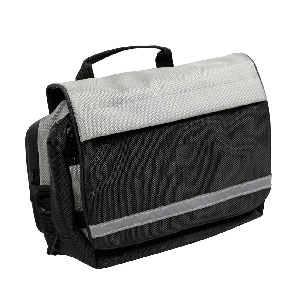 Borsa manubrio impermeabile. Fibbie per il fissaggio al manubrio. Inserto riflettente. Con tracolla e maniglia. 7 scomparti + 1 tasca trasparente porta-cartina. Cuciture rinforzate. Zip impermeabile. In poliestere 1680D accoppiato con PVC. Dimensione: 25x17x16 cm ca.