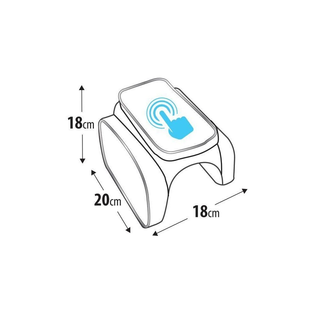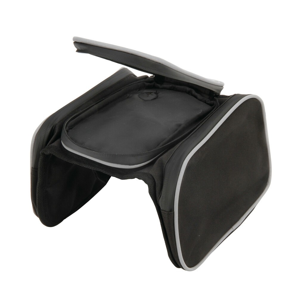 Tasca porta telefono con sezione frontale trasparente per uso touch screen. Asportabile a strappo senza dover rimuovere il borsello. Pratiche tasche laterali multi-uso per contenere qualsiasi oggetto o utensile (1,5 L). Realizzato in robusto poliestere 600D con finestra in PVC impermeabile. Inserti riflettenti. Fissaggio al telaio tramite nastri a strappo. Dimensione: 20x18x18cm