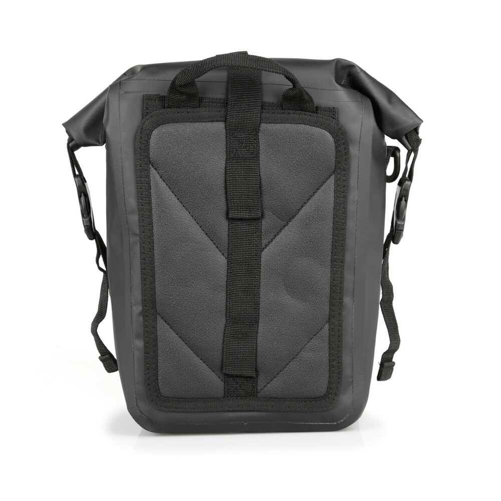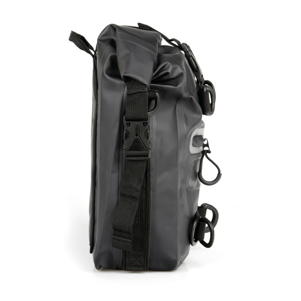 Borsa impermeabile con sistema di chiusura roll top per garantirne l'impermeabilità. Realizzata in PVC 500D Tarpaulin senza cuciture con saldature ad alta frequenza. Maniglia per trasporto a mano e cinghia tracolla. Dotata di attacchi per il fissaggio tramite cinghie alla moto (non incluse). Comoda zip frontale con bordatura riflettente per accedere a una piccola tasca interna. Misure: 30x20x12cm