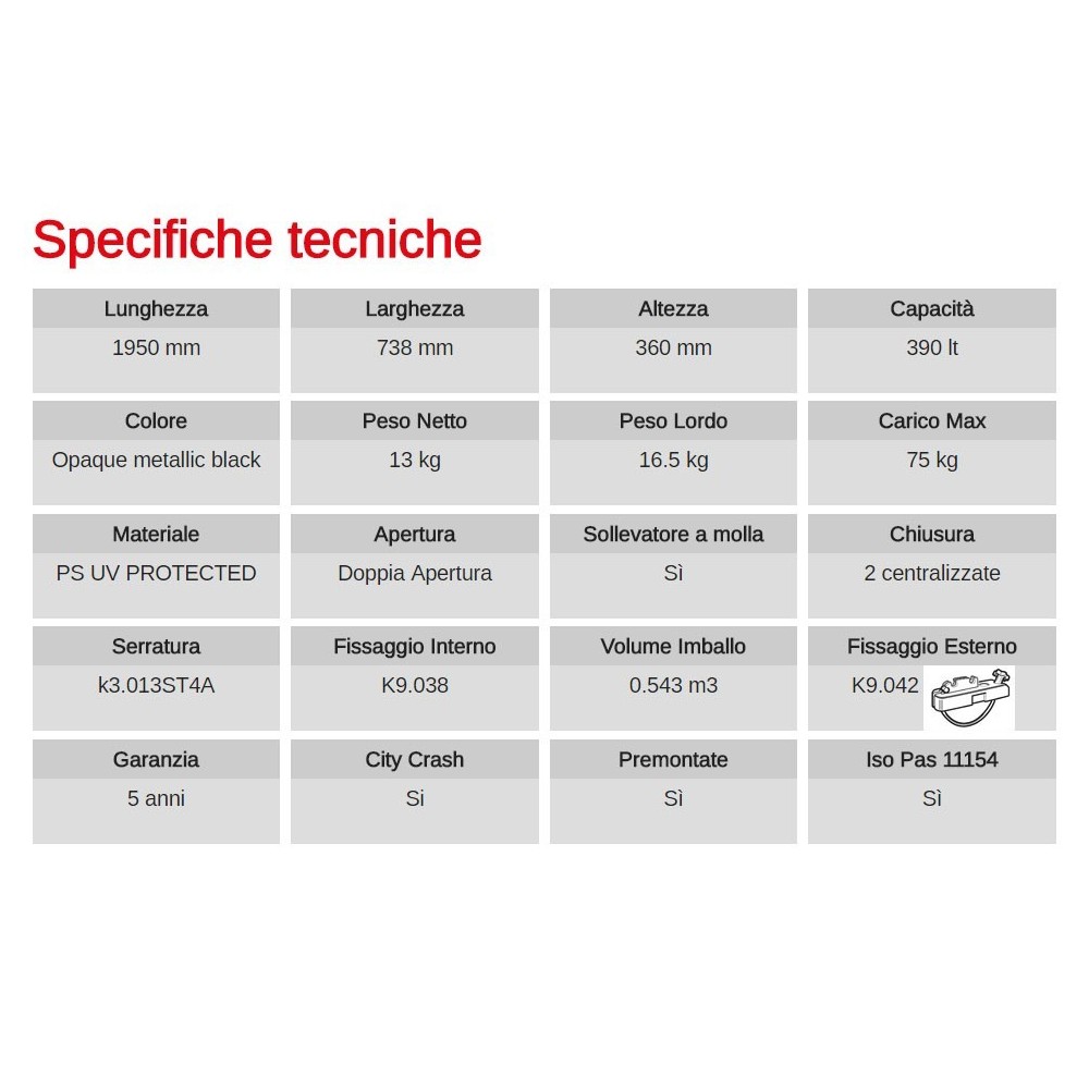 Box portatutto frutto della capacita' innovativa dei tecnici G3 con il pratico sistema di preforatura che contraddistingue la gamma di box tetto. E' sufficiente una penna a sfera! Semplice e veloce, permette al cliente di non dover maneggiare strumenti pericolosi. Il risultato e' ottimale, assolutamente migliore di qualsiasi altro presente in commercio: il sistema di preforatura migliora la precisione del montaggio e contribuisce ad aumentare la qualita' del box G3. SISTEMA DI APERTURA DUAL SIDE!: L'apertura Dual side permette di aprire il box da entrambi i lati con la stessa chiave! per agevolare il montaggio, il carico e lo scarico. Sistema di chiusura Elegance adatto a tutti i tipi di barre fino a 90mm. Modello : SPARK 480, per tutte le caratteristiche e dimensioni vedi immagine allegata.