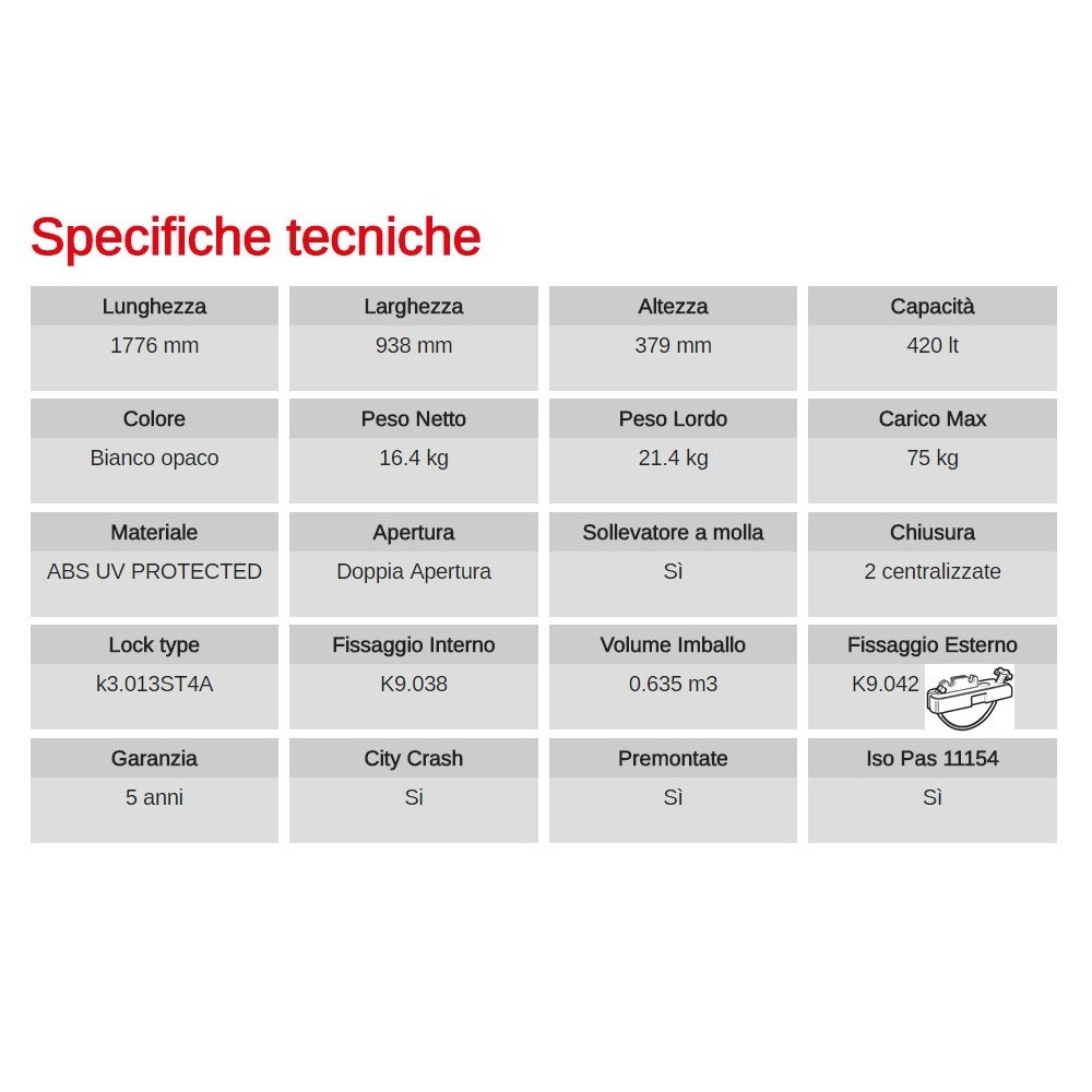 Box portatutto frutto della capacita' innovativa dei tecnici G3 con il pratico sistema di preforatura che contraddistingue la gamma di box tetto. E' sufficiente una penna a sfera! Semplice e veloce, permette al cliente di non dover maneggiare strumenti pericolosi. Il risultato e' ottimale, assolutamente migliore di qualsiasi altro presente in commercio: il sistema di preforatura migliora la precisione del montaggio e contribuisce ad aumentare la qualita' del box G3. Modello : SPARK 520 Bianco, per tutte le caratteristiche e dimensioni vedi immagine allegata. SISTEMA DI APERTURA DUAL SIDE!: L'apertura Dual side permette di aprire il box da entrambi i lati con la stessa chiave! per agevolare il montaggio, il carico e lo scarico.