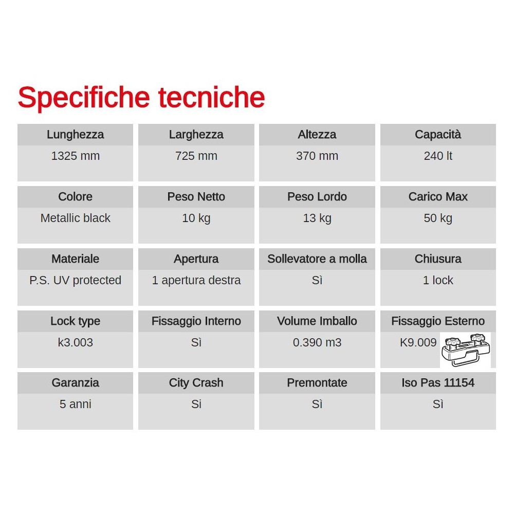 Box portatutto frutto della capacita' innovativa dei tecnici G3 con il pratico sistema di preforatura che contraddistingue la gamma di box tetto. E' sufficiente una penna a sfera! Semplice e veloce, permette al cliente di non dover maneggiare strumenti pericolosi. Il risultato e' ottimale, assolutamente migliore di qualsiasi altro presente in commercio: il sistema di preforatura migliora la precisione del montaggio e contribuisce ad aumentare la qualita' del box G3. Modello : HELIOS 320, per tutte le caratteristiche e dimensioni vedi immagine allegata.