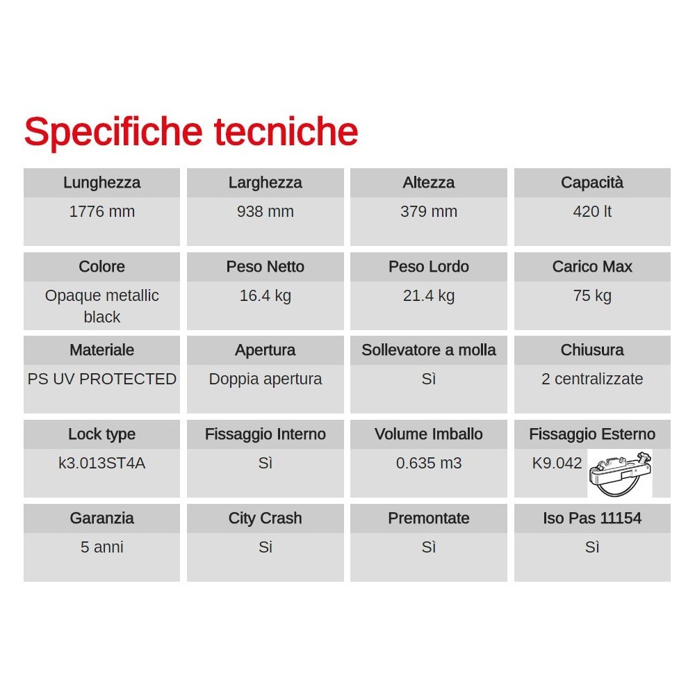 Box portatutto frutto della capacita' innovativa dei tecnici G3 con il pratico sistema di preforatura che contraddistingue la gamma di box tetto. E' sufficiente una penna a sfera! Semplice e veloce, permette al cliente di non dover maneggiare strumenti pericolosi. Il risultato e' ottimale, assolutamente migliore di qualsiasi altro presente in commercio: il sistema di preforatura migliora la precisione del montaggio e contribuisce ad aumentare la qualita' del box G3. Modello : SPARK 520, per tutte le caratteristiche e dimensioni vedi immagine allegata.