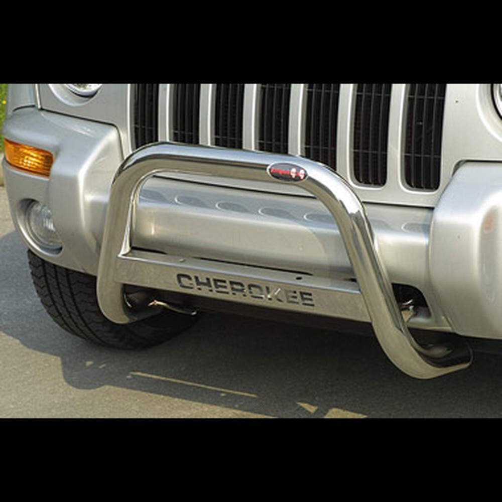 Compatibilita': Jeep Cherokee immatricolata dal 2001 al 2007. Bull Bar anteriore in acciaio inox lucido diametro 60mm. Note: traversa con scritta modello auto