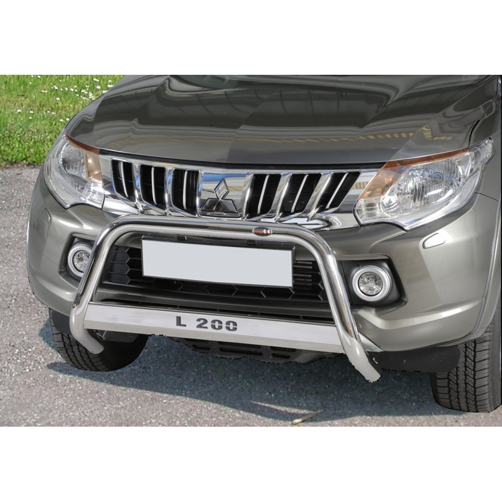Compatibilita': Mitsubishi L200 Club Cab/Double Cab immatricolata dal 2015 al 2018. Bull Bar anteriore in acciaio inox lucido, diametro 60mm, con scritta modello auto. Omologazione Europea: SI
