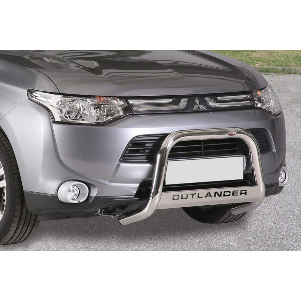 Compatibilita': Mitsubishi Outlander immatricolata dal 2013 al 2014. Bull Bar anteriore in acciaio inox lucido diametro 60mm. Note: traversa con scritta modello auto. Omologazione europea: SI